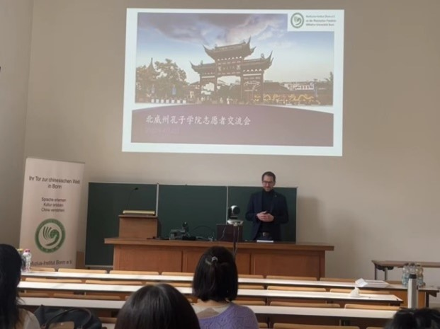 此次交流会在波恩孔院德方执行院长叶翰识博士的致辞中拉开序幕。叶瀚识博士首先欢迎了远道而来的老师们,他表示,在过去的两年中,由于疫情的原因,北威州的孔院志愿者交流活动中断,现在非常高兴线下的交流活动能够继续举办。通过此次交流会,希望大家可以增进了解,互相学习,促进交流。他衷心祝愿各位老师能在波恩度过美好的一天。杜塞尔多夫孔院的中方院长胡嘉荔博士随后也作了简短的致辞。在致辞中,她回顾了2019年的交流会,并表示此次的交流会为自疫情以来的第一次线下交流会,她对此十分期待,希望老师们可以畅所欲言,积极表达自己的看法,她也对本次活动的顺利举办表示祝贺。