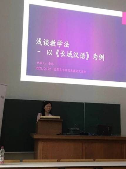 随后,来自波恩孔院的李玮老师做了名为“浅谈教学法——以《长城汉语》为例”的讲座。在讲座中,她介绍了波恩孔院的教材使用情况,并针对教学中的一些情况分享了自己的看法。讲座后,老师们积极讨论,针对各所孔院所使用的不同教材交流了自己的看法,并就实际教学中学生们的学习水平不一致该如何处理等问题进行了深入探讨。