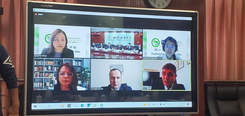 北京时间4月15日下午,罗马尼亚锡比乌卢奇安·布拉卡大学孔子学院2022年理事会以视频会议的方式顺利召开。北京语言大学校长刘利、副校长张宝钧、国际教育管理处/孔子学院工作处处长陈丽霞,罗马尼亚锡比乌卢奇安·布拉卡大学校长索林·拉杜(Sorin Radu)、副校长安德烈·特里安(Andrei Terian)、孔子学院外方院长西尔维娅·弗洛雷亚(Silvia Florea)与中方院长王囧及等相关负责同志参加会议。