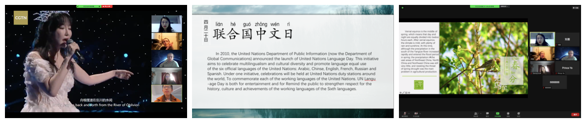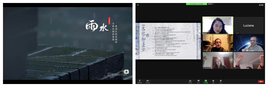 本次线上中文日庆祝活动由杜贝贝老师主持。活动伊始的视频为大家展示了联合国中文日以及仓颉造字等相关知识,立即引起了大家的好奇心。视频之后是我问你答,通过互动,汉语爱好者们了解了联合国中文日的主旨、文化渊源以及节气谷雨等知识,随后杜老师又以节气——谷雨为引,辅助图片等对中国传统24节气一一进行了介绍。在本环节中,汉语爱好者们不但了解了文化,还学习了24个节气的相关词汇。图频并茂,让他们意犹未尽。