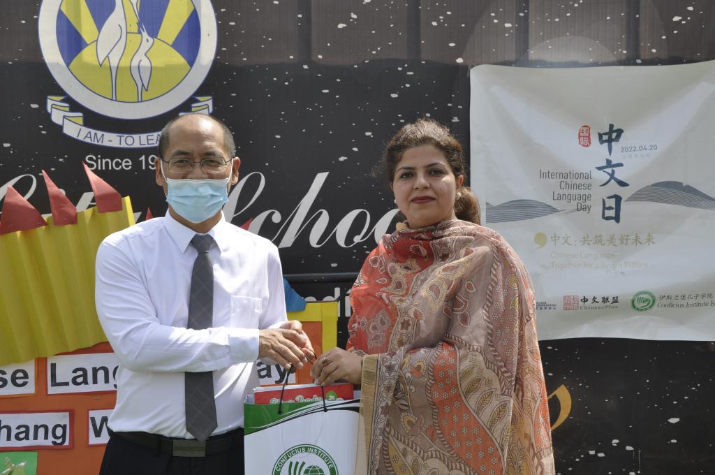 庆祝活动开始,在巴中两国国歌演奏后, 几十个孩子上演了师生们自编的中国特色的舞龙和团扇等节目。接着孔院张伟院长致辞,介绍了中文日是为纪念中国文字的创始人仓颉而设,在几千年的使用中, 有着丰富的文化内涵, 孔院表示将于City School 合作, 为学生们开设中文课, 并欢迎大家参观孔院希望大家有机会访问中国。孔院还向City School的校长SARAH MALIK女士赠送了一些汉语教材和中国文化类图书。庆祝活动结束后,孔院阿斯兰老师为五年级约30名孩子进行了第一节中文课体验活动。阿斯兰老师热情洋溢地教,学生们聚精会神地学, 30多分钟的课堂效果非常好,学生们能较为熟练而标准地说你好、谢谢、中巴友谊等句子。校长SARAH MALIK 女士全程参与了这一节中文课堂体验。
