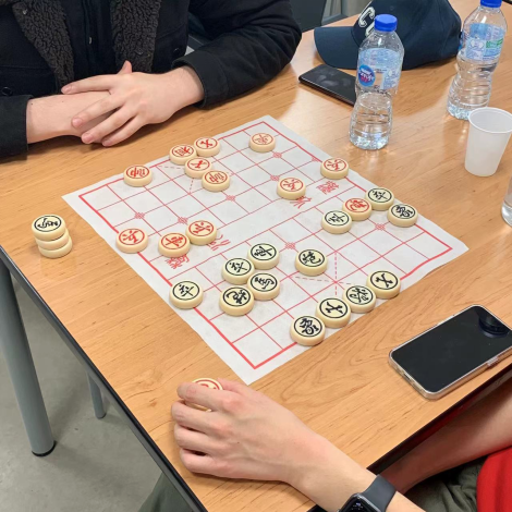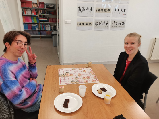 在随后的中国传统棋牌游戏活动中,来访者和孔院实习生们一起在象棋游戏中排兵布阵,活动室里不时响起博弈的欢呼声。