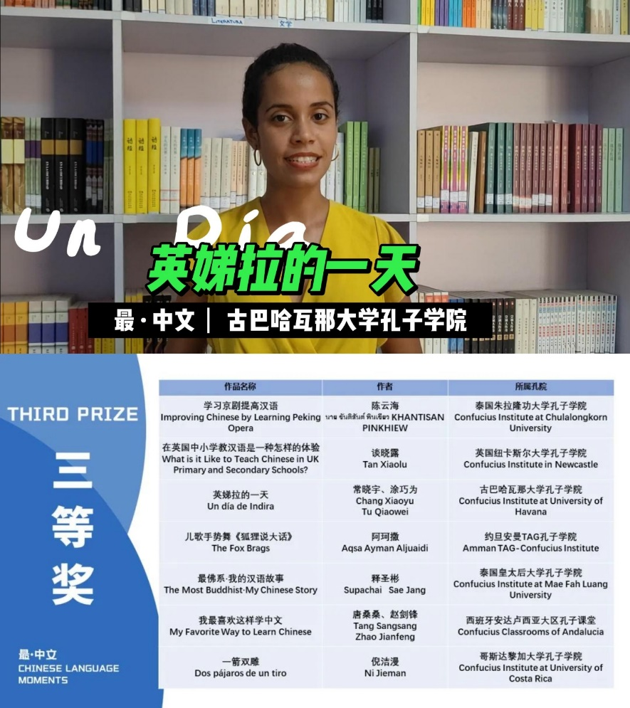 三等奖获奖作品《英娣拉的一天》,讲述了哈瓦那大学孔院高级班学生英娣拉的中文故事。除了孔院学员的身份,她还是一名称职的初级班中文老师。在学习中文的五年里,每逢有课的日子,英娣拉都要在凌晨四点起床,趁着黑夜与黎明交替的微光晨曦,搭乘很久的公交车,才能按时赶到孔院。英娣拉凭借对中文的满腔热情,乐观面对这样日复一日的辛苦。经过数年努力,不仅掌握了一口流利的中文,还凭借自身的语言能力和学习经验,成长为一名合格的中文教师,帮助更多古巴人了解和学习这门她深爱的语言。在英娣拉身上,我们看到她作为一名汉语学习者具有的可贵品质,更感受到她对汉语的真挚热爱。我们相信,在哈瓦那大学孔院的努力下,古巴会涌现出更多像英娣拉这样优秀的汉语学习者与本土教师,会有更多的古巴人爱上中文。我们共同期待着这一天。