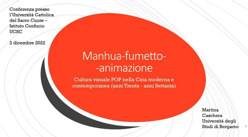 当地时间12月2日上午,由米兰圣心大学语言科学与外国文学系和圣心孔院合作组织的“漫画,动漫和动画——中国流行视觉文化”讲座在圣心大学哲梅里(Gemelli) 校区成功举办。本次讲座在线上线下两个会场同时进行,由贝加莫大学的卡斯切拉克(Mattina Cascherac)博士主讲,圣心大学中文项目负责人夏慕华(Chiara Piccinini)教授主持,孔院意方院长竺易安(Elisa Giunipero)教授,中方院长梁清教授,部分孔院教师和圣心大学师生参加了本次讲座。