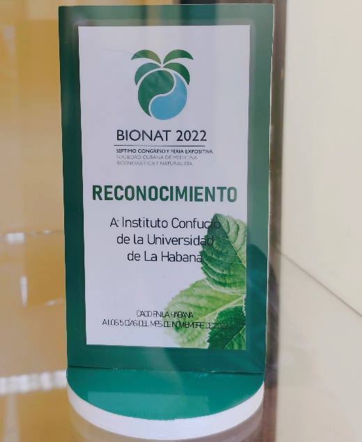 11月5日,哈瓦那大学孔子学院荣获第七届古巴生物与自然医学会(BIONAT)嘉奖,表彰孔院作为古巴中医文化传播的重要基地,在中医教育方面付出的努力,以及取得的非凡成就。古巴生物与自然医学会汇集了致力于传统医药发展的专业人士,提供学习交流的全国型平台,鼓励将自然传统医学结合到临床实践、医学教育、药物生产和医学研究中,为推进中医在古巴的发展做出了巨大贡献。