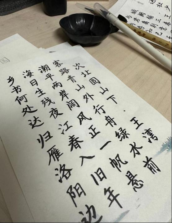 秦少萍还注意到,在景山公园有一些老人用毛笔沾水在地上写字。“其他留学生同学不理解他为什么要这样写字,不一会就没了,但还是要写,但是我了解。写半个小时,一个小时,就像听音乐,或者做运动一样,是一种放松方式。不管是写了就没了,还是留在纸上,写完之后心就静下来了。”疫情发展最严重的时候,秦少萍经常在宿舍里面练习毛笔字,“看那个爷爷写字,回来我也写,写字像上瘾一样,忍不住。”毛笔字和硬笔书法有一定的差异,秦少萍凭借热爱不断摸索写字技巧,完全不放松对自己的要求,“有时候写的不好看,我就有点脾气,坐在那里一遍遍的写,写到满意,然后就会很开心”。