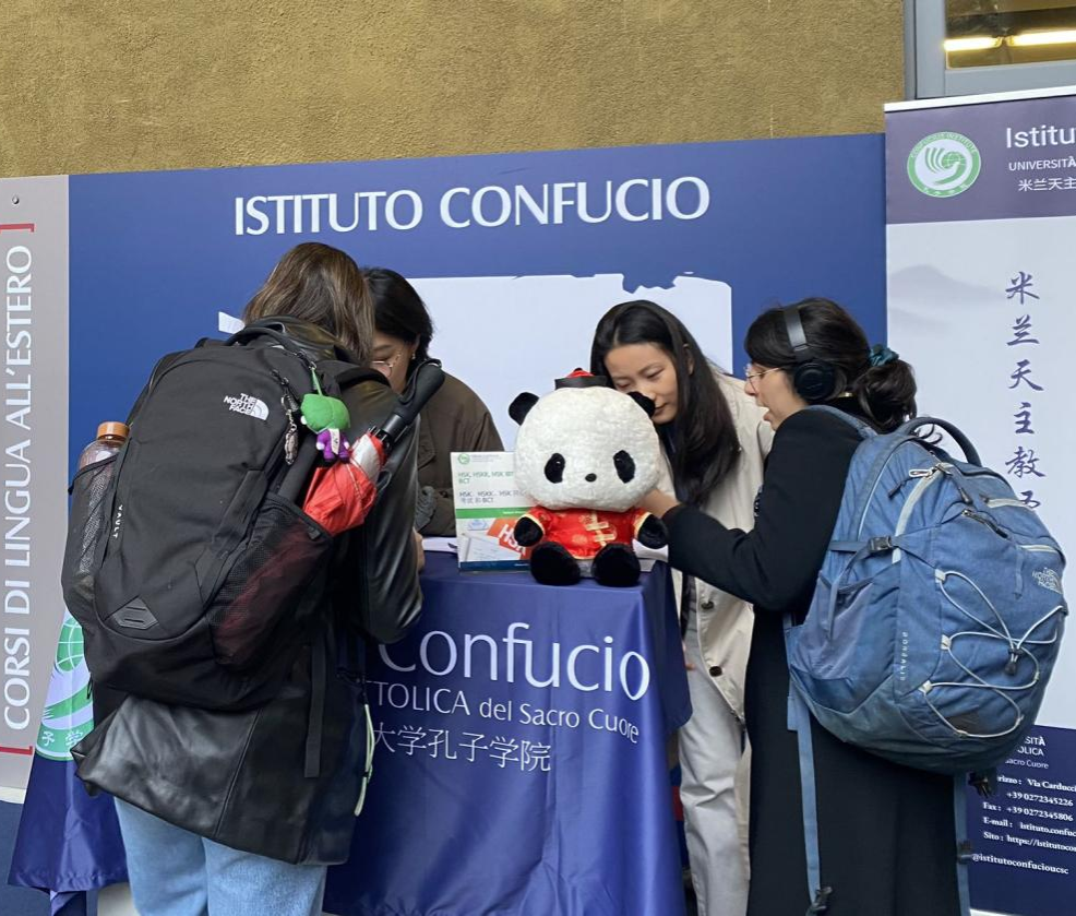 10月18日,孔院秘书Alessandra Beretta(亚历珊德拉·伯莱塔)、教师陈镜伊、梅雨涵参加了布雷西亚校区的国际周活动。活动刚刚开始,就有圣心大学的一名博士生前来询问留学中国的项目。她以前也通过“孔子学院奖学金“去过中国短期学习,她非常喜欢中国,也很怀念在中国的生活,希望这次能够去中国再学习一年,精进自己的汉语,也更加深入地了解中国。孔院秘书Alessandra热情地为感兴趣的学生介绍了孔院工作,解释了”奖学金“和”夏令营“项目,并分享自己在北京语言大学留学一年的见闻和体会,鼓励大家到中国去学习、体验。活动中,此前在我院下属孔子课堂多米兰尼(Don Milani)高中的学生劳拉·萨科(Laura Sacco)也来到了我们的展台,她现在已经是圣心大学布雷西亚校区的学生了,她依然选择了汉语课程,她表示从高中开始她就对汉语、中国很感兴趣,希望能够有机会去中国学习、生活。