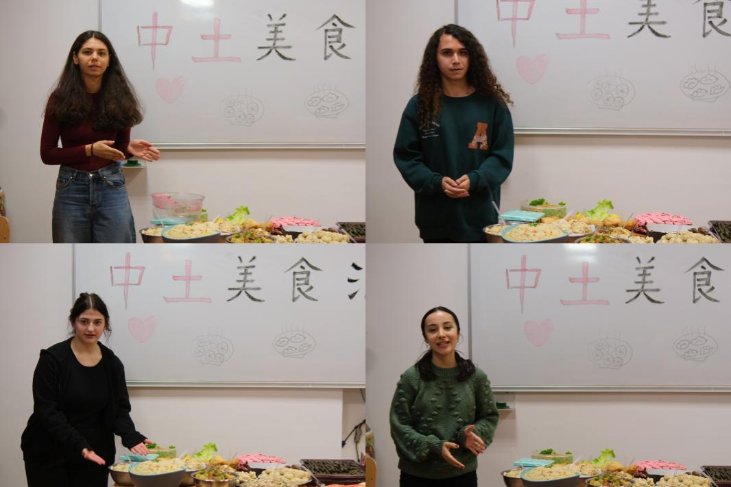 中土翻译系系主任小花老师(Buket Çetinbaş)和奥坎孔院中方院长胡巍老师进行了简短而热情的开场介绍,鼓励师生们通过这次美食活动品味并感受中土饮食文化。接着,来自中土翻译系预备班的四位学生用流利的中土双语向大家生动地介绍了孔院教师准备的四道经典中国美食:松软可口的胡萝卜牛肉馅儿小笼包、色香味全的扬州炒饭、浓郁咸香的土豆炖牛肉以及嫩滑鲜美的葱姜鸡。学生们介绍了这些中国菜品的发源地、制作所用的食材、主要的烹饪方法以及菜肴的口感。现场师生在聆听的同时,也对这些美食产生了浓厚的兴趣,表示要赶紧品尝一下。