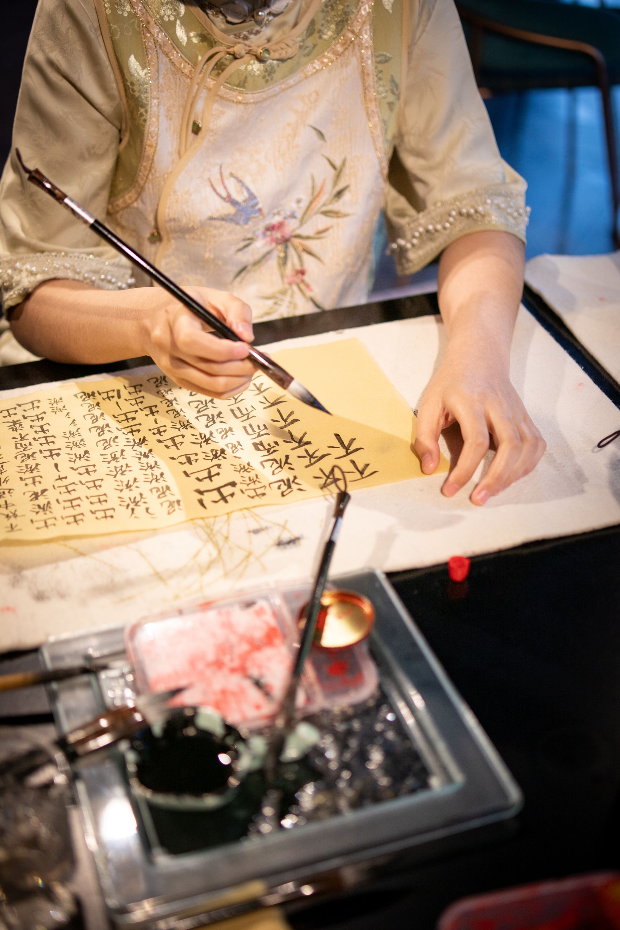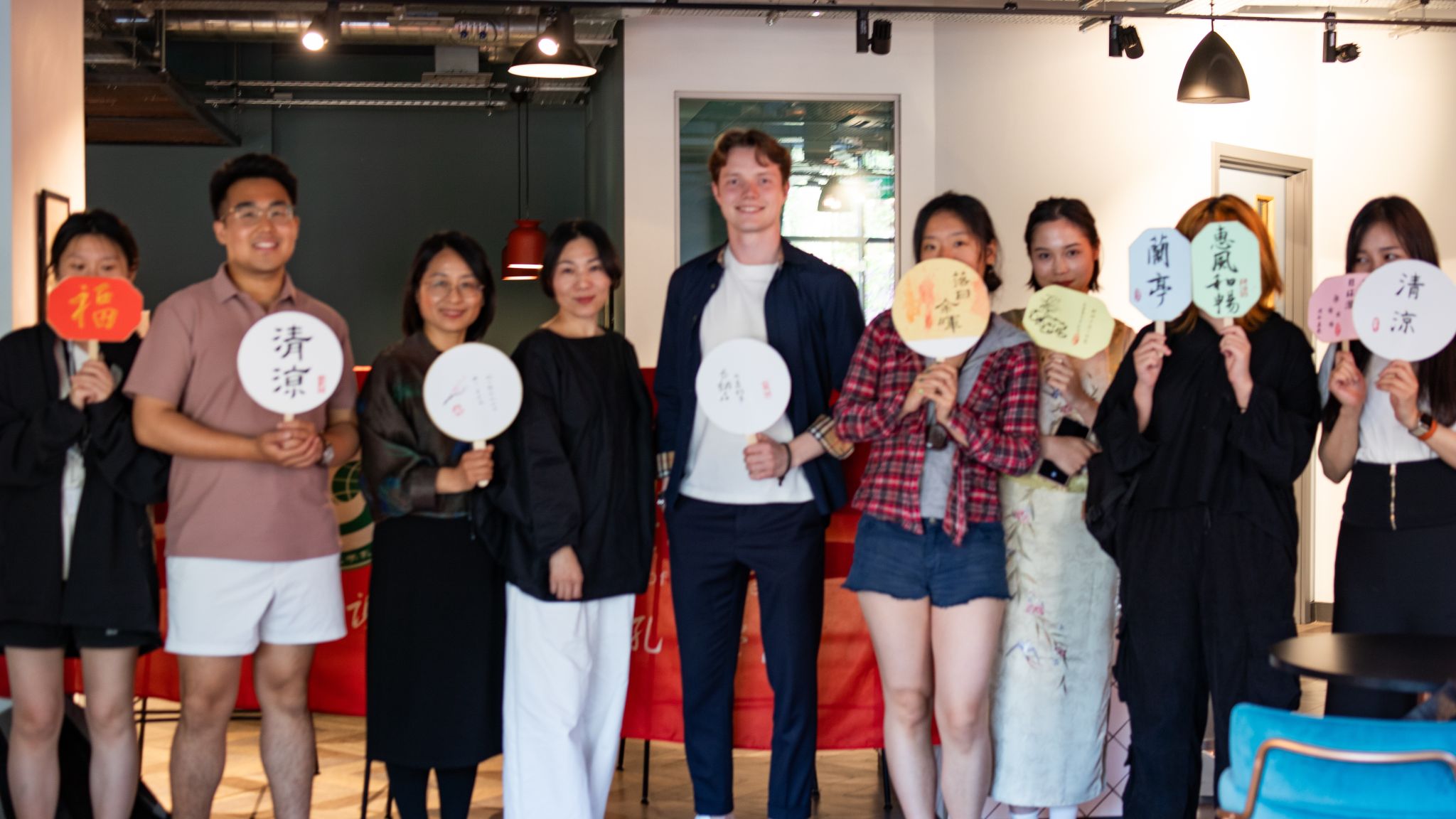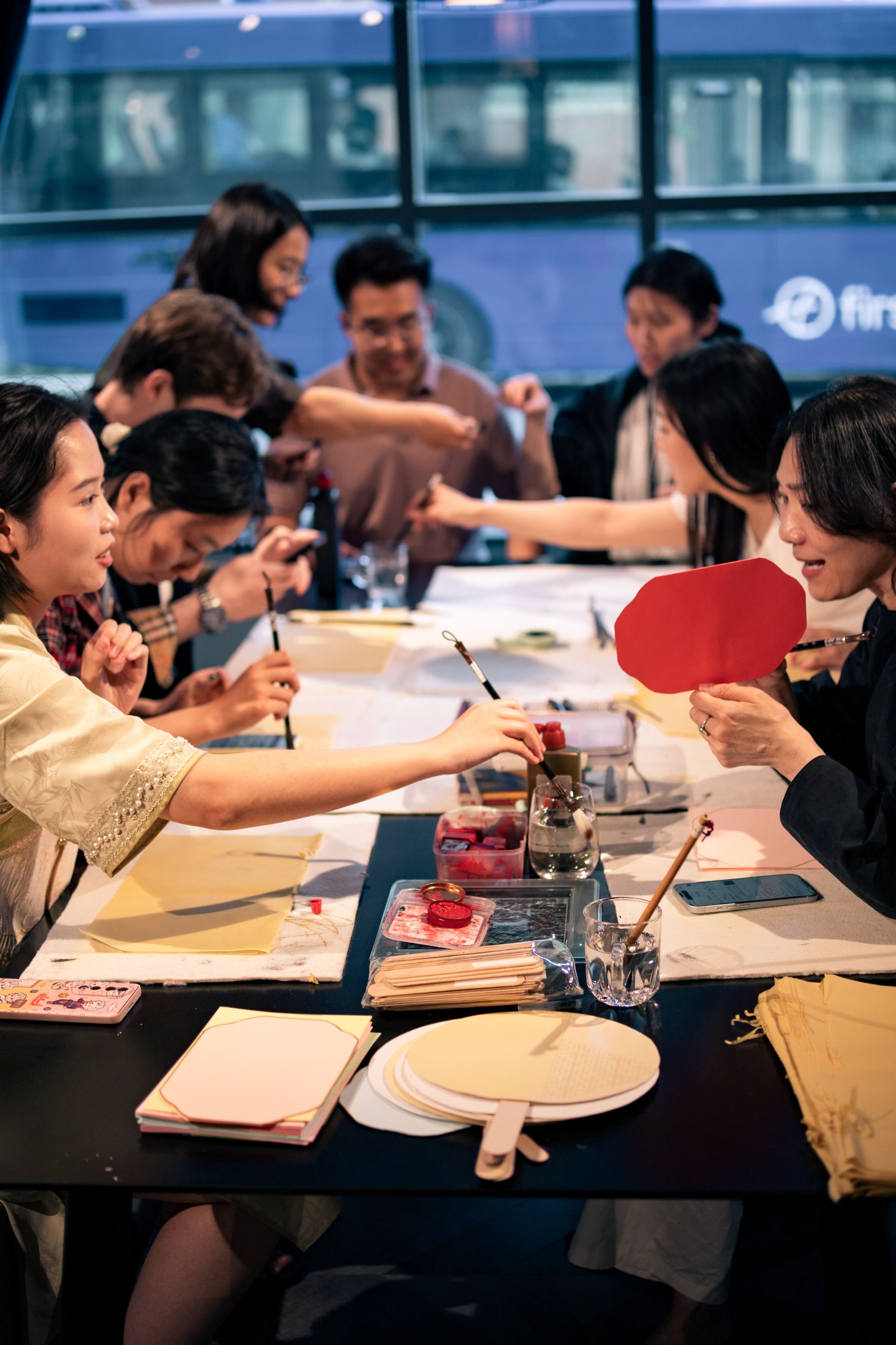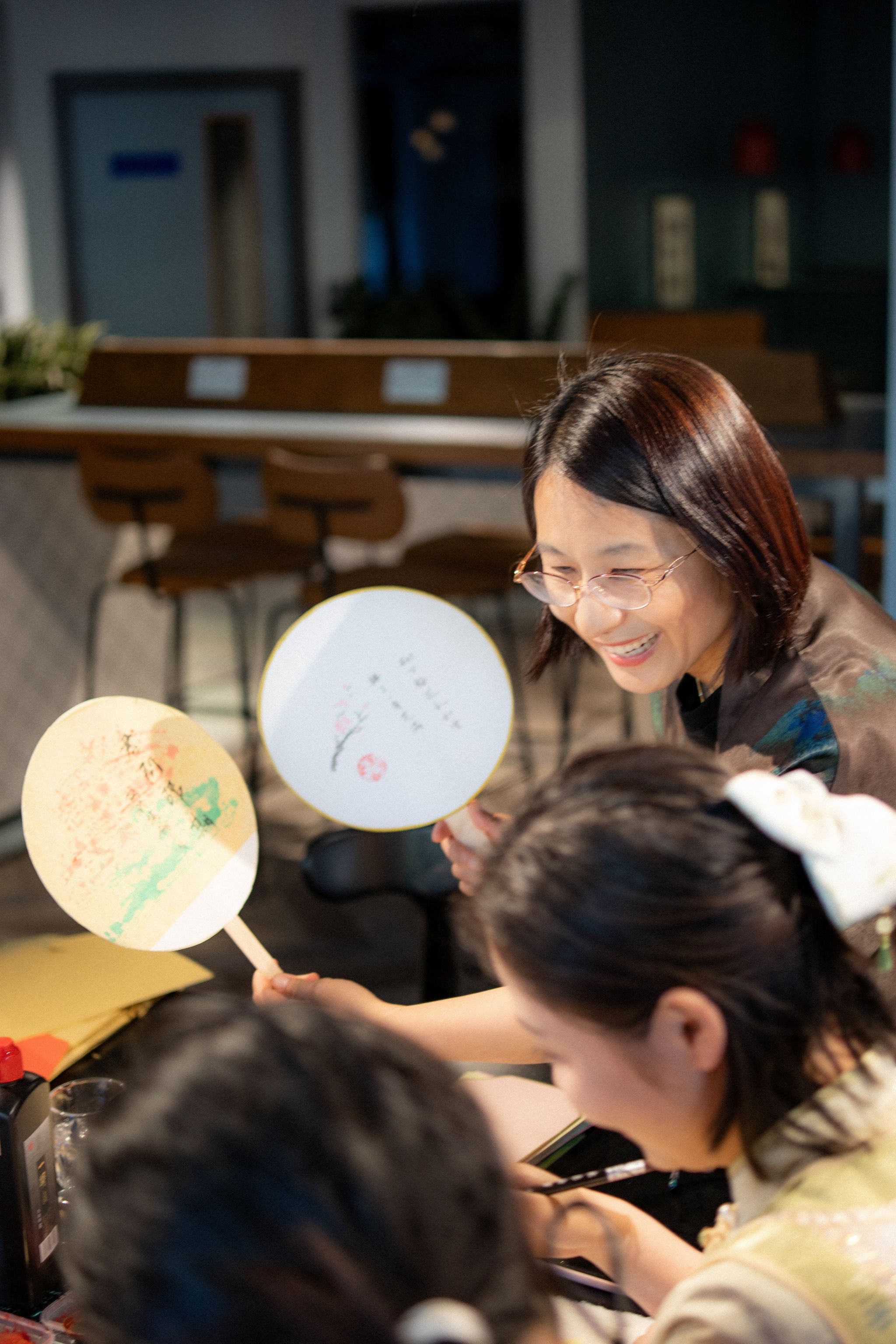 活动现场,孔院老师挥毫泼墨,示范中国书法和绘画技艺。参与者们兴致勃勃地尝试书写汉字,还亲手绘制水墨团扇,将书法艺术与实用美学完美结合。