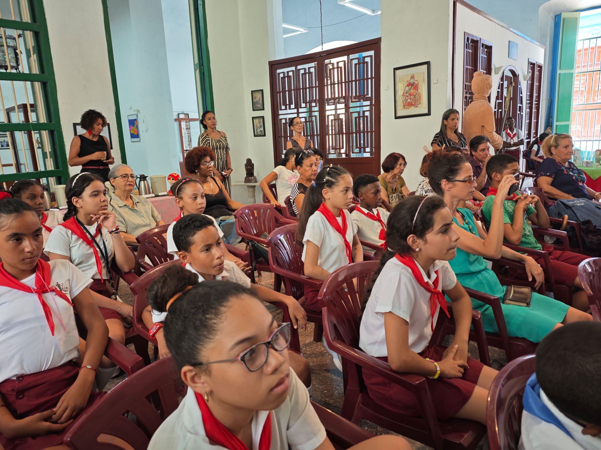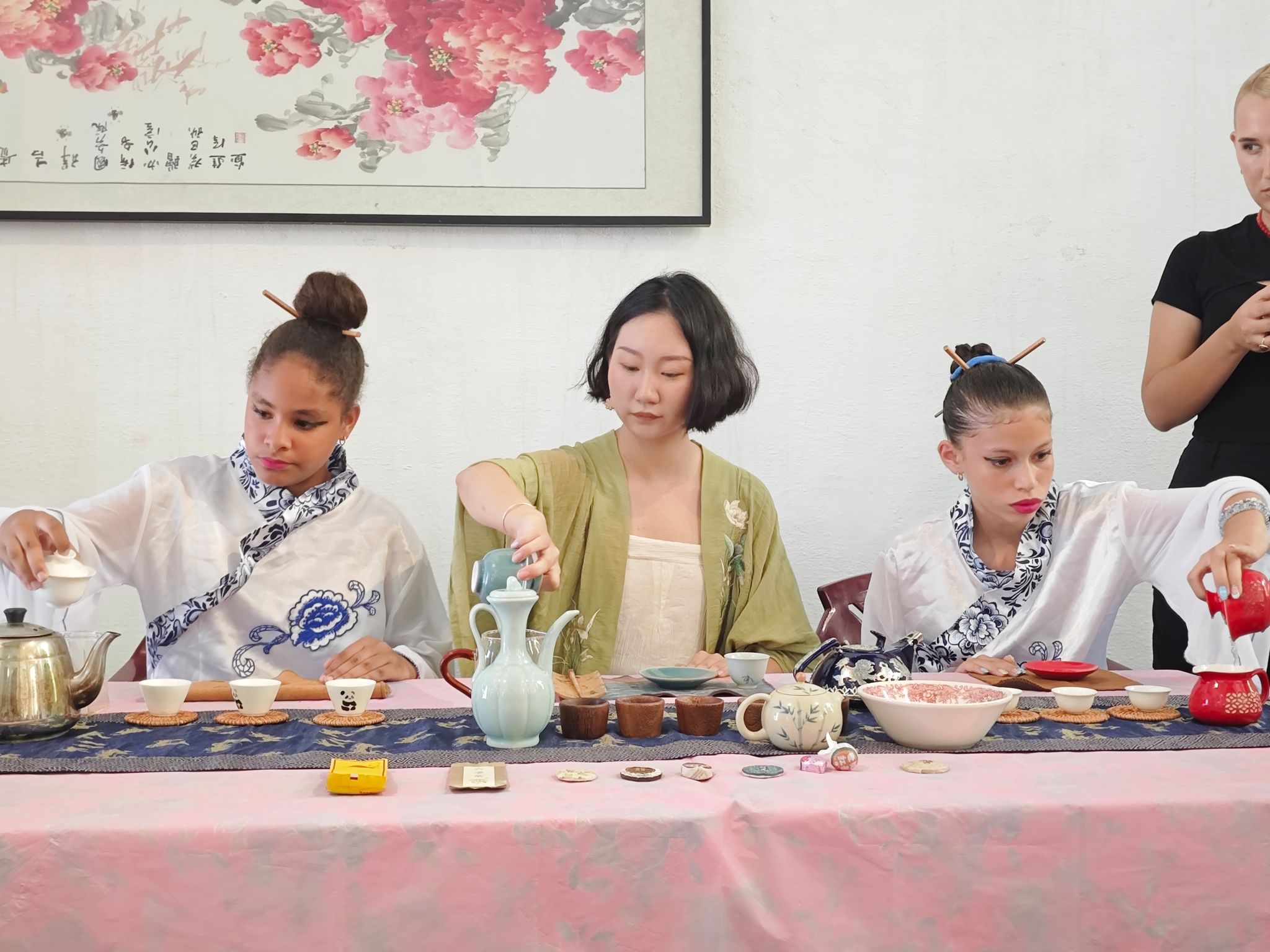 活动由一场典雅精致的茶艺展示拉开序幕。孔子学院志愿者教师郭芮希带领来自古巴Hermanos Sa íz Montes de Oca学校的两名小学生共同完成茶艺呈现。这两名学生此前在孔子学院接受了茶文化教学,在当天的展示中,他们熟练的动作和与观众的互动,充分展现了学习成果。郭芮希老师详细讲解了茶具的功能与泡茶的流程,并邀请现场观众品鉴,深入领略中国茶艺的独特魅力。孔子学院以“教学+实践”的模式,将中国茶文化带入古巴课堂,并在活动中实现了文化 传播与沉浸体验的深度融合。