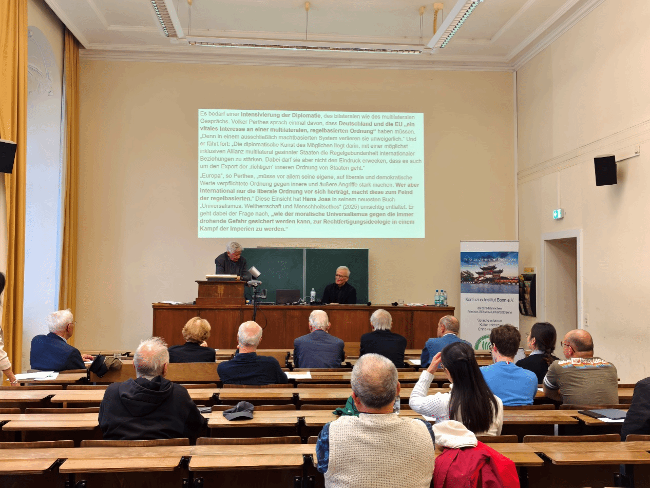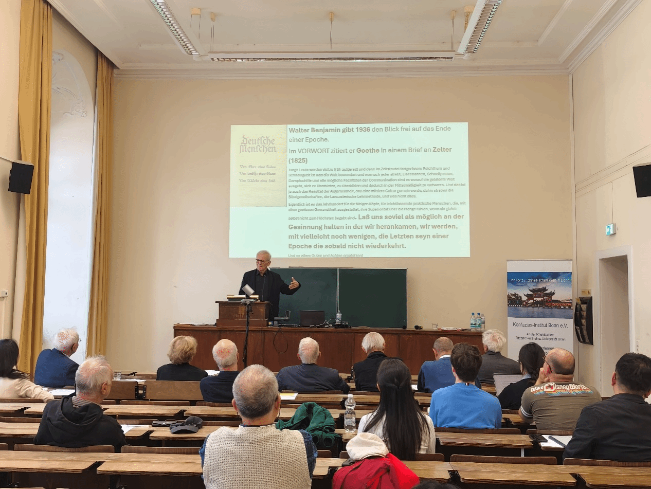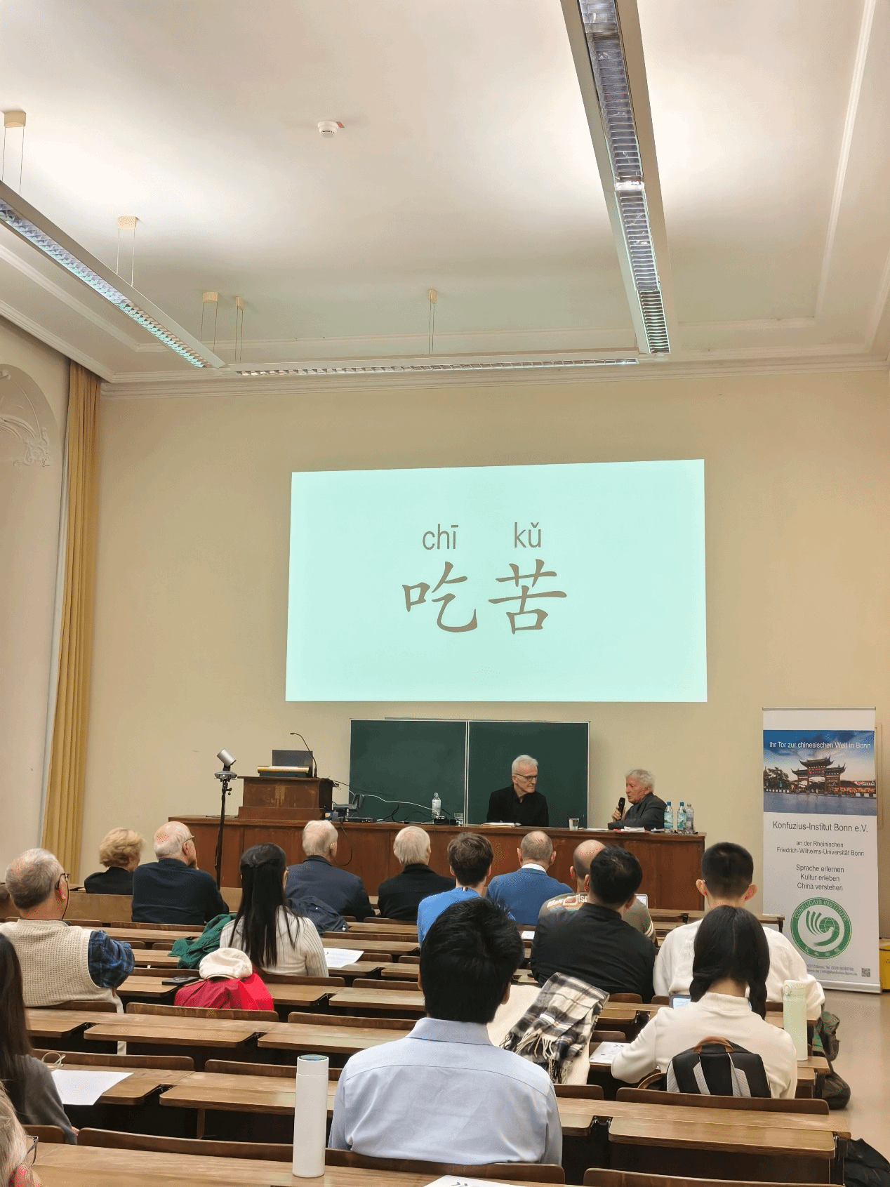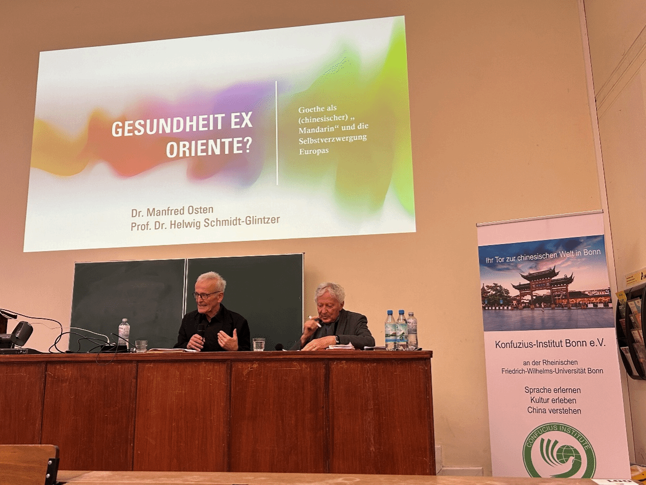 北语新闻网10月6日电(通讯员 杨淑兰 摄影 杨淑兰 张奥京)当地时间9月29日,德国波恩孔子学院在波恩大学成功举办“健康从东方来:歌德的‘士大夫’形象与欧洲的自我矮化”专题讲座。本次活动邀请著名汉学家施寒微教授(Prof. Dr. Helwig Schmidt-Glintzer)和前外交官、洪堡基金会前秘书长曼弗雷德·奥斯滕博士(Dr. Manfred Osten)担任主讲嘉宾,德国历史博物馆前馆长、德国前文化部副部长赫尔曼·舍费尔(Hermann Schäfer)教授主持活动。