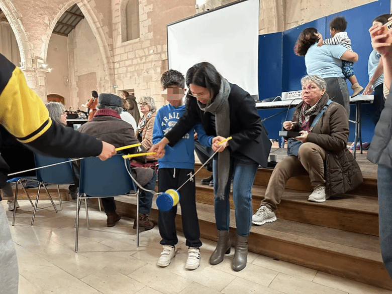 空竹体验则让许多法国朋友第一次见识这种富有节奏感的传统技艺。工作人员示范后,小朋友们就迫不及待地上手,有的甚至能成功抛起再接住,引来不少惊喜的喝彩。空竹的呼呼声在节日的空气中显得格外活泼轻快。