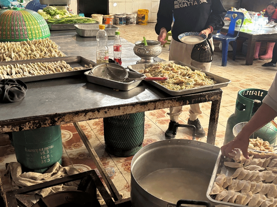 上午12时许,玛希隆大学孔子学院中方院长林艳、泰方院长张曹武、外方副院长王澜鹏带领志愿者及玛希隆大学中文系10名学生抵达福利院。学院为院内150名儿童提供了全天的饮食支持,包括午餐的炒面、师生共同制作的中式饺子以及各类零食。