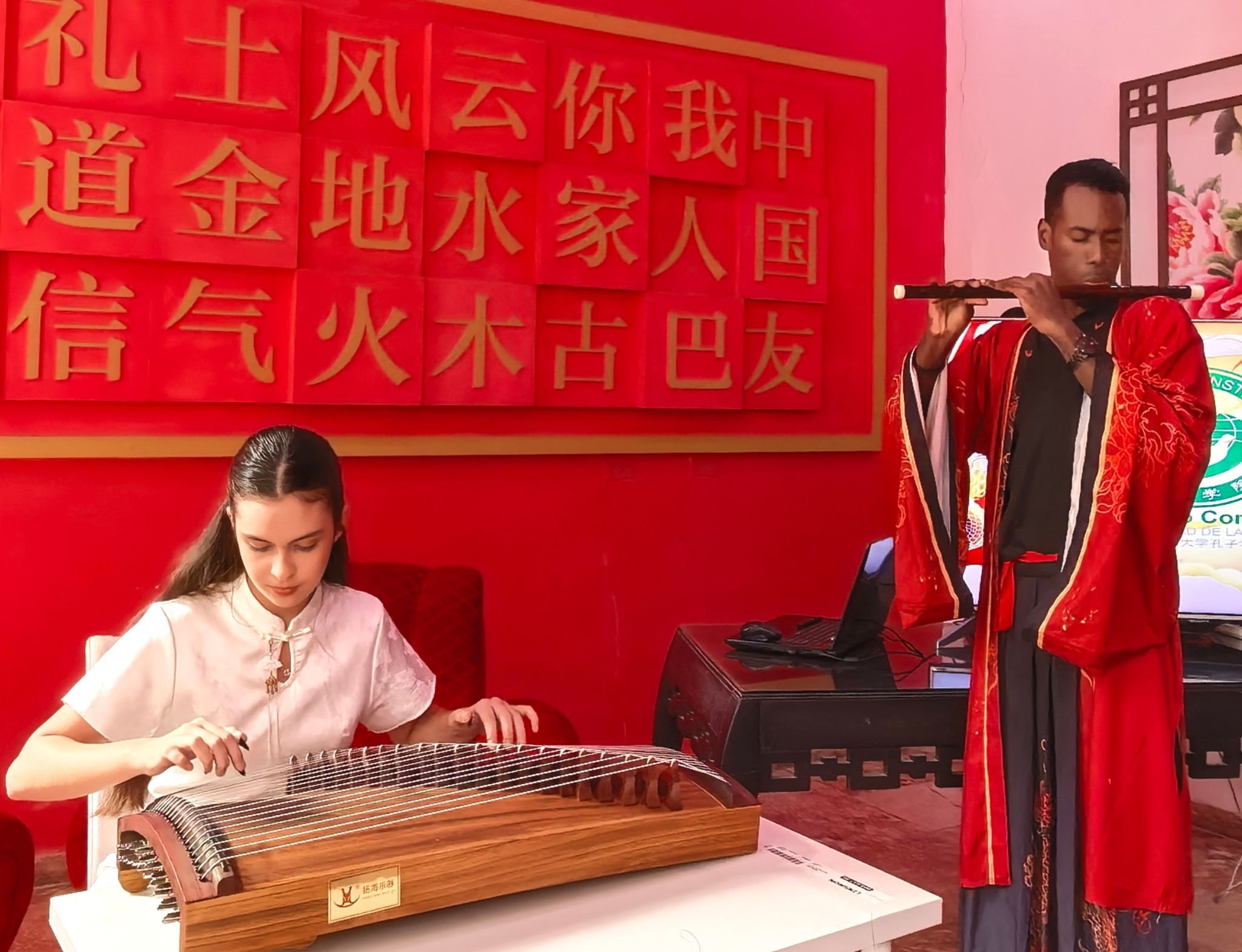 紧接着,孔院学生士郎与甜甜为观众带来了古筝与竹笛合奏《茉莉花》。他们专注的神情与娴熟的技艺交织出动人的旋律,展现了中古两国青年在文化交流中跨越语言与国界的深厚共鸣。