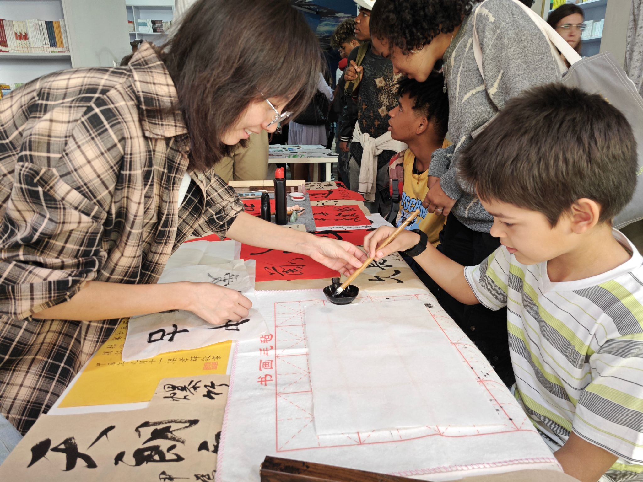 书法展位是开放日的一大亮点,展示了学生们的优秀书法作品。书法老师现场为观众题写名字,吸引了众多参与者驻足欣赏。学生们也亲自挥毫泼墨,创作了“古巴爱中国”等表达中古友谊的作品。这一活动不仅让学生体验了中国书法的艺术魅力,也激发了他们对汉语学习的热情。