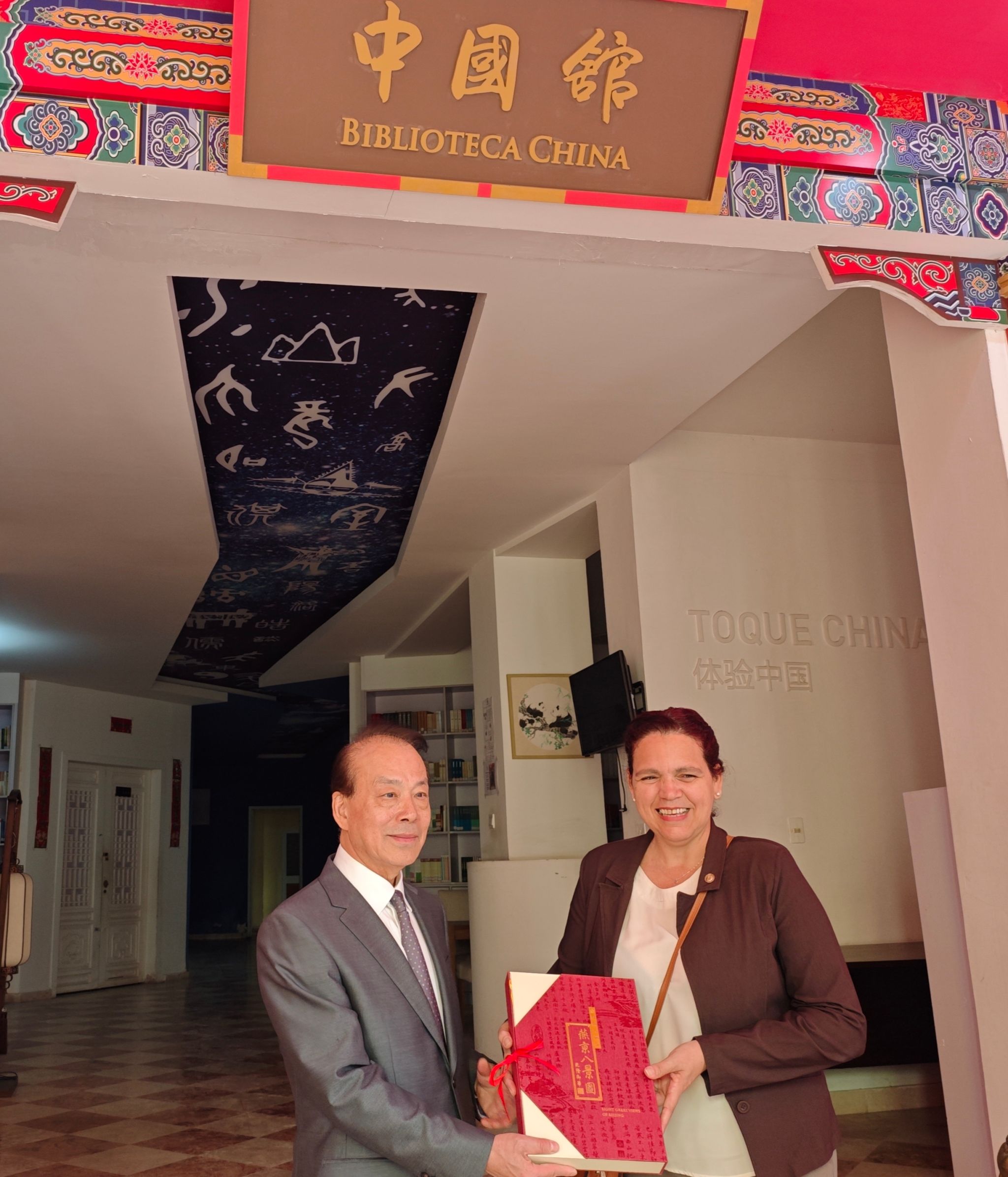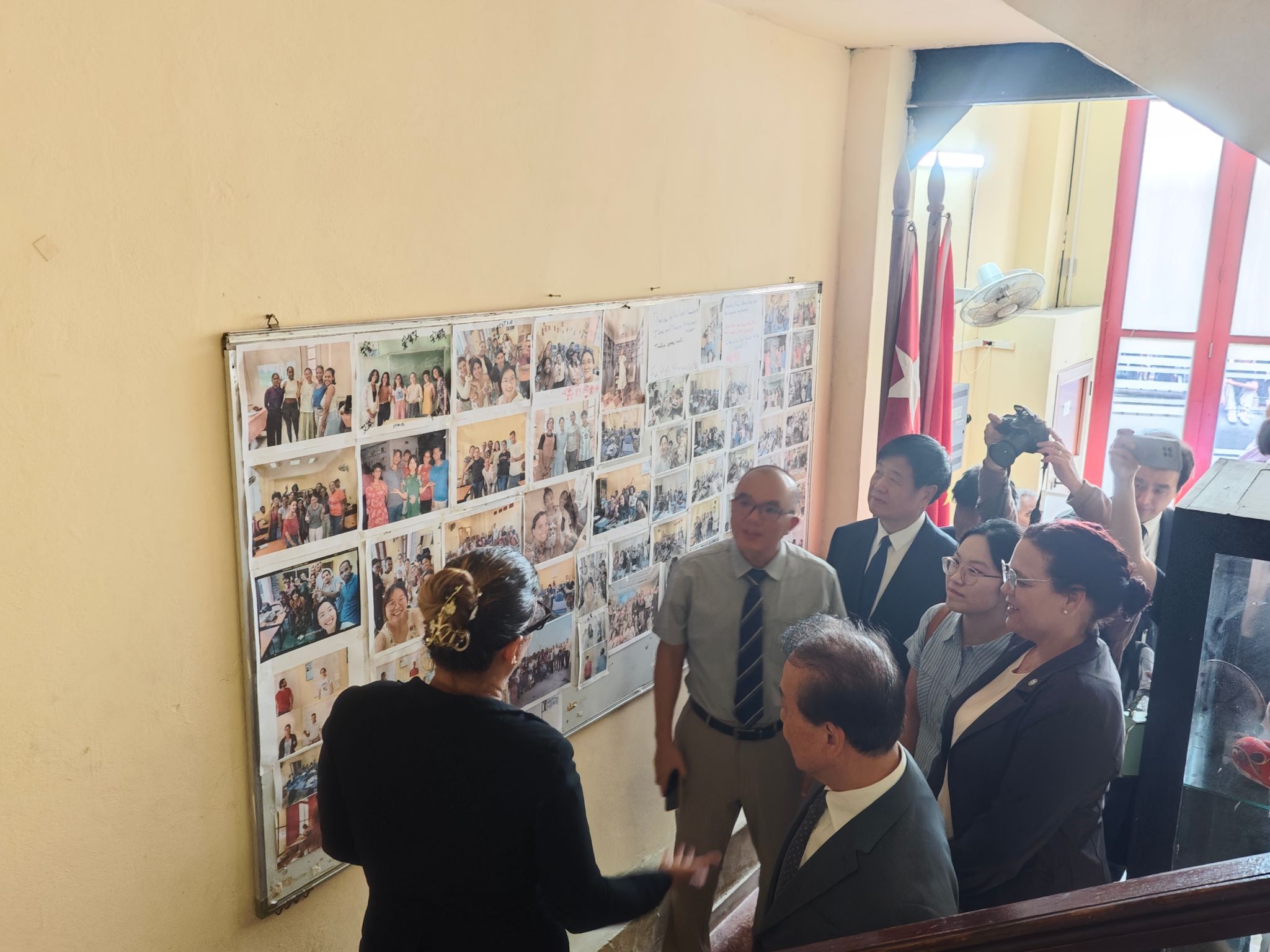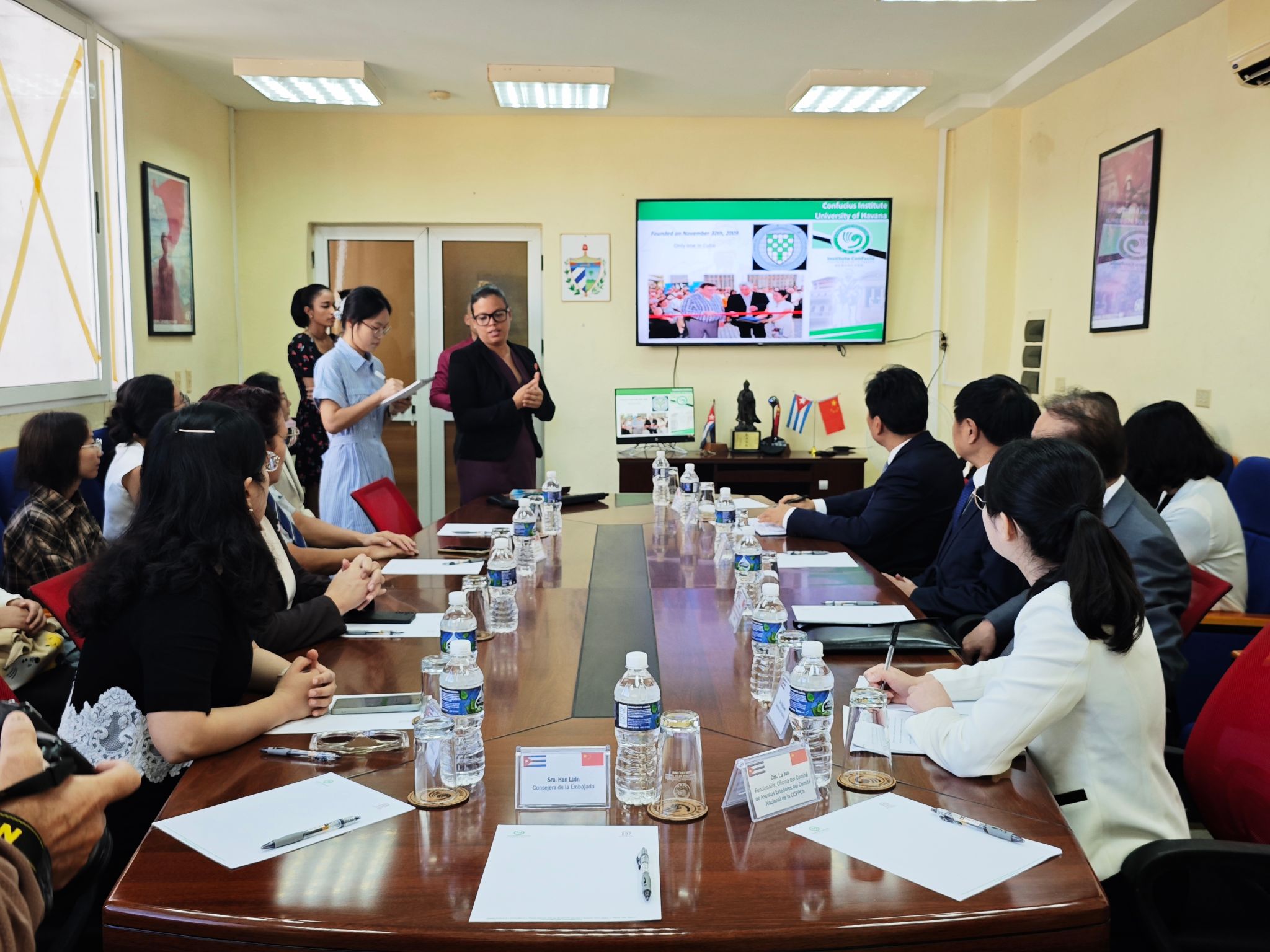 随后,代表团参观了孔院的中文图书馆、教学楼及文化活动场地,详细了解了孔院的教学发展、文化传播和未来规划。在座谈会上,古方院长杰茜·迪亚斯·费尔南德斯(Jeisy Díaz Fernández)介绍了孔院的主要成果与未来计划。她表示,孔子学院已经成为古巴中文人才培养的“主渠道”,累计开设学分课程与短期培训80余种,注册学员人数已超过1.15万人次。图书馆藏书达3万册,并根据学生需求不断优化馆藏资源,受到了广大学员的好评。近年来,孔院学生在“汉语桥”世界中文大赛中屡获佳绩,包括美洲冠军、世界十五强等荣誉,成为中外语言与文化交流的典范。当前,随着中文在古巴的热度持续攀升,孔院计划为古巴全国各地的优秀学生提供全方位支持,推动汉语教学与旅游、医学、人工智能等重点领域的职业发展深度融合。
