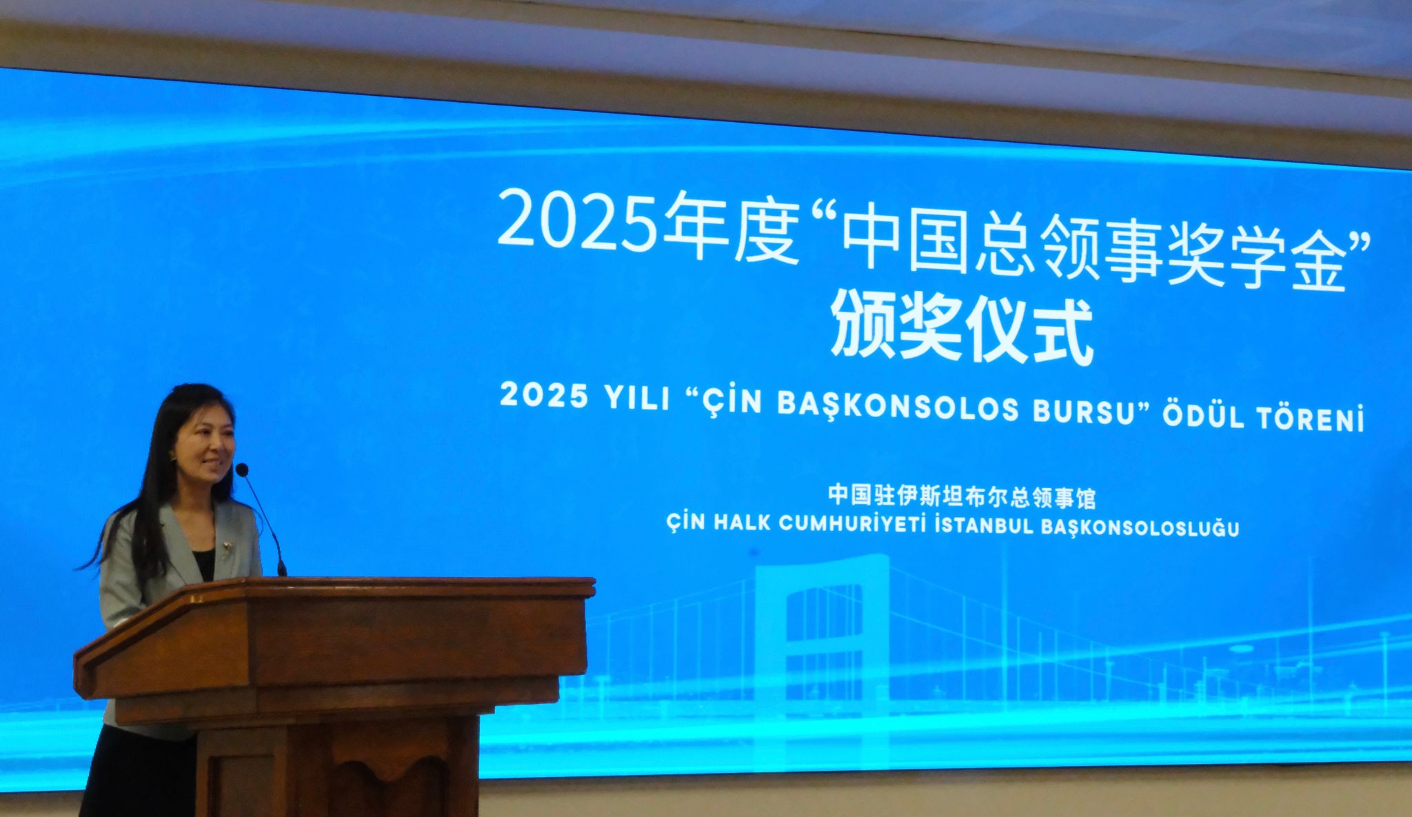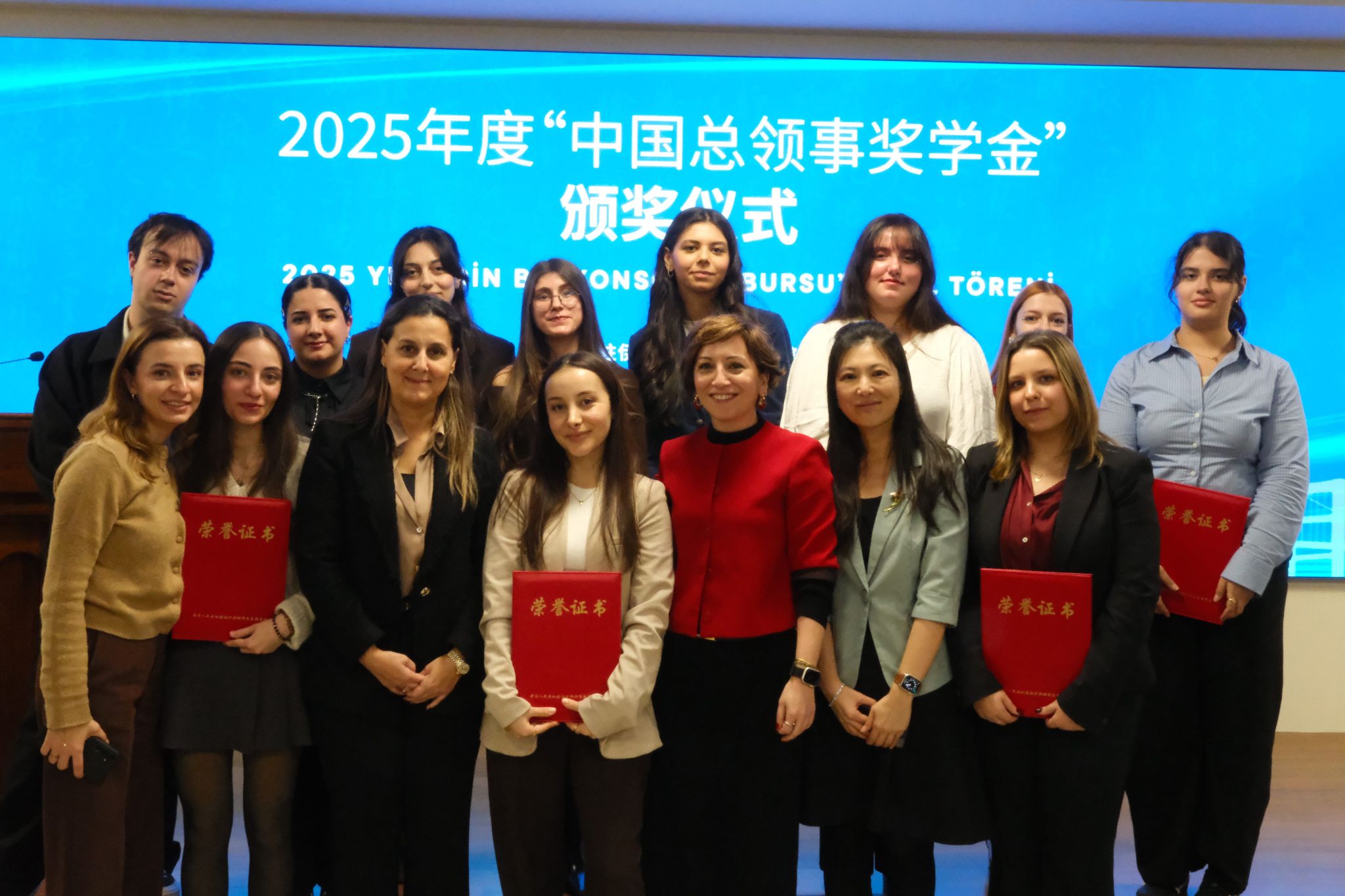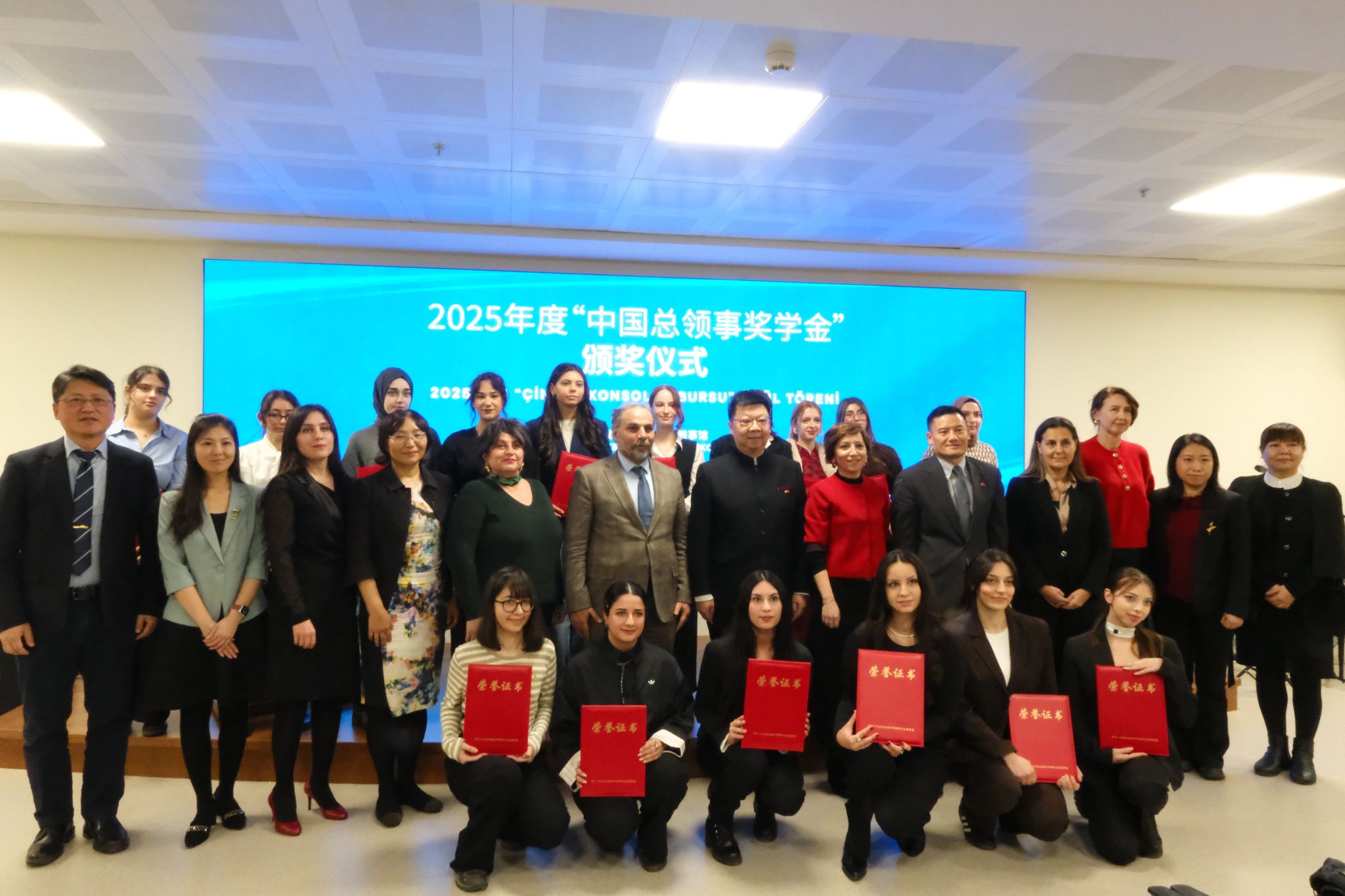 北语新闻网1月8日电(通讯员 贺洁 摄影 李依婷)2025年12月29日,中国驻伊斯坦布尔总领事馆举行2025年度“中国总领事奖学金”颁奖仪式。奥坎孔院13名学员在评选中脱颖而出,荣获各级别奖项。奥坎大学校长古丽兹∙穆安(Güliz Muğan)教授、副校长格克切∙通奇(Gökçe Tunç)教授、奥坎孔院中外方院长及教师代表受邀出席了颁奖仪式,与中国驻伊斯坦布尔总领事魏晓东先生、副总领事尚健先生,以及领区孔院、高校师生代表约150人共同见证了这一荣誉时刻。