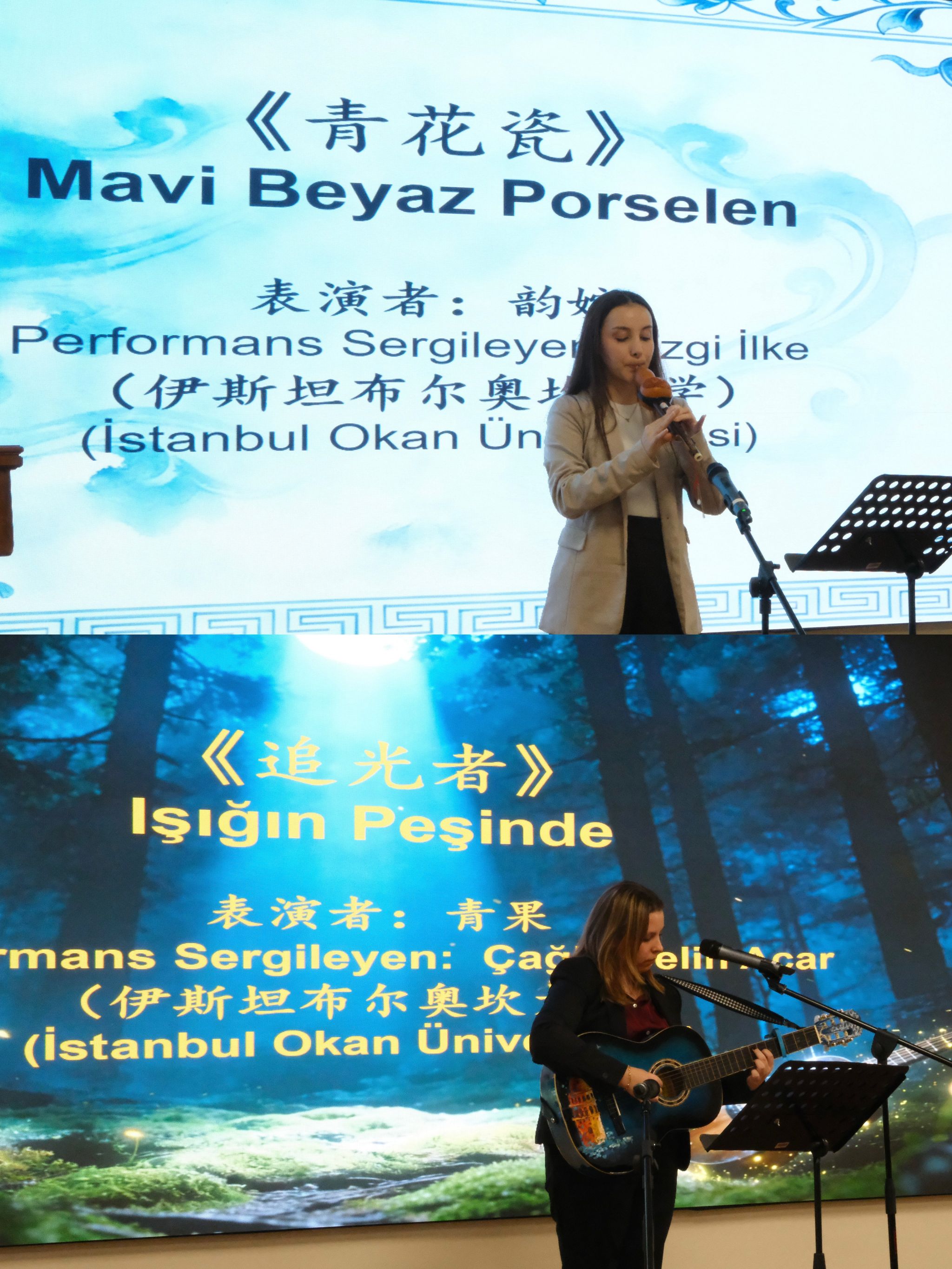 本次颁奖仪式汇聚了伊斯坦布尔及周边多所高校的优秀中文学习者。其中,奥坎大学的学生韵婉(Ezgi İlke)、青果(Çağla Selin Acar)凭借优异成绩及综合表现荣获一等奖,并在颁奖仪式上展现才艺,成为现场焦点。两位学生首先分享了她们与中文结缘的故事。韵婉从土耳其中餐馆打工的经历为起点,通过“汉语桥”比赛走向更广阔的舞台;青果则因喜爱中国游戏音乐而开启学习之旅。她们不约而同地表示,中文是沟通心灵、连接文明的桥梁。