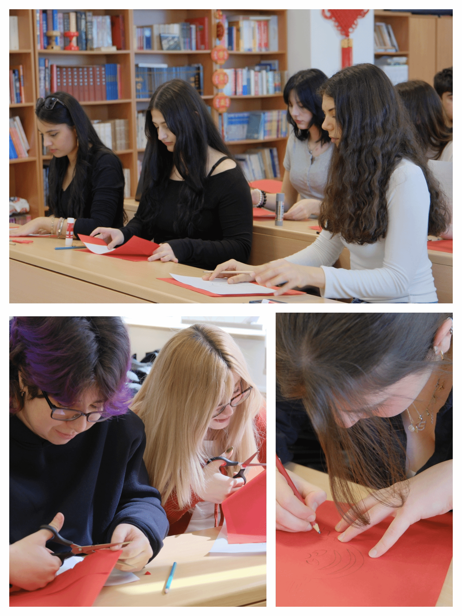 最受期待的动手体验环节,将活动氛围推向高潮!孔院老师与中国学生志愿者分组指导,从折纸、描画,到剪刻、修整,手把手教土耳其学生制作剪纸作品。红纸翻飞,剪刀轻响,大家专注跟着步骤操作,从简单的灯笼、中国结,到寓意新春大吉的“春”字,再到马年专属的小马剪纸,原本空白的红纸,在一双双巧手下渐渐变成形态各异的剪纸作品。中土学子互帮互助,遇到制作难题时彼此支招,偶尔为剪出完美纹样欢呼,也为小小的失误开怀一笑,温馨又热闹的氛围萦绕全场。