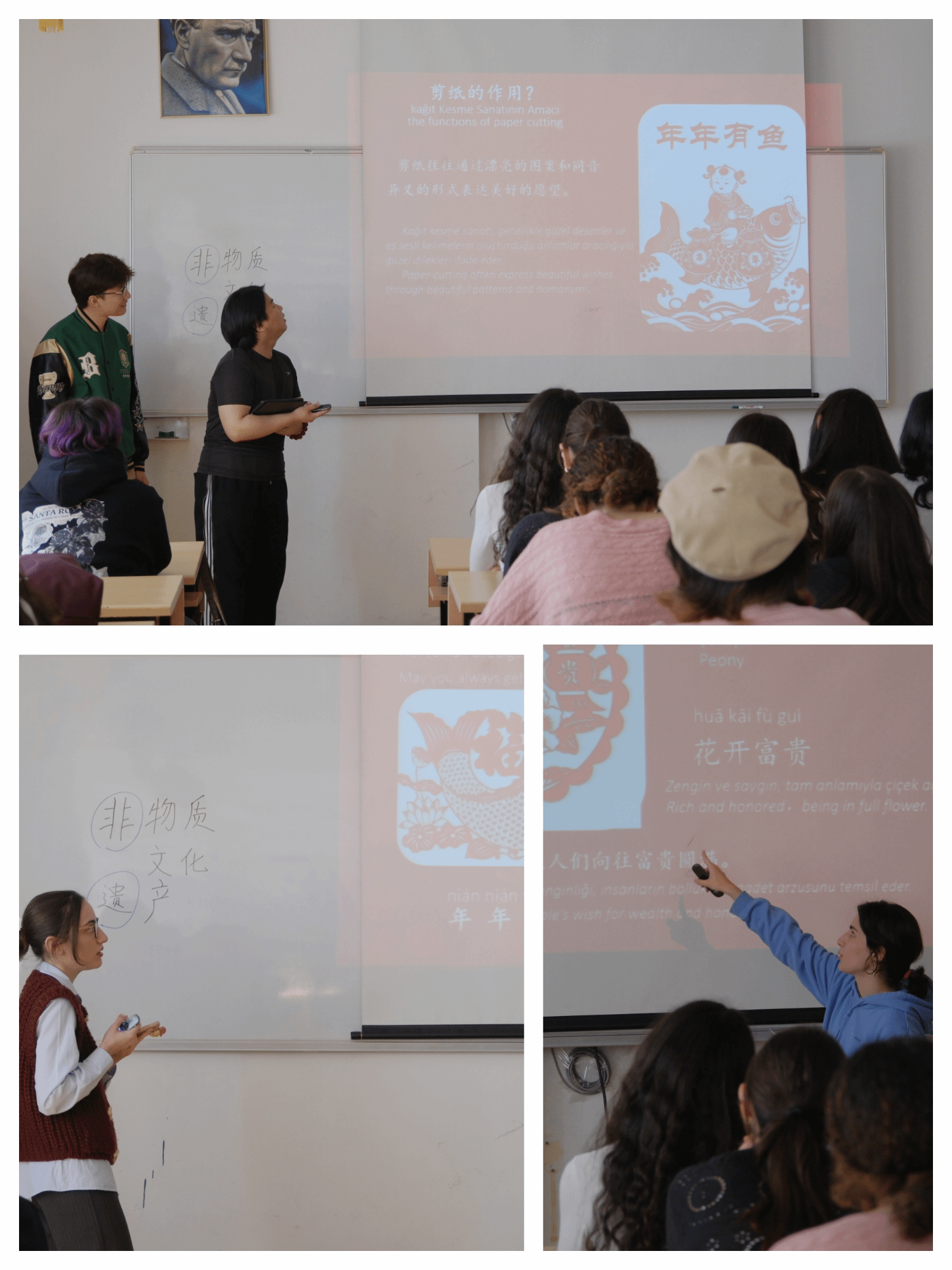 本次活动延续了非遗系列的特色,由中土学生搭档担任主讲,用通俗易懂的双语为现场师生开启了剪纸文化之旅,并在轻松愉悦的氛围中,带领大家快速走进了这门承载着中国生活智慧的非遗艺术。从春节的窗花、十二生肖剪纸,到婚礼的 “囍” 字、龙凤呈祥纹样,再到祝寿的寿桃、松鹤延年图案,他们细致讲解了剪纸在节日、婚嫁、祝寿等民俗场景中的多样用途;同时拆解“福”“春”“余”等吉祥汉字,以及牡丹、荷花、梅花等植物剪纸的谐音寓意。现场的很多土耳其学子不禁感慨:剪纸不仅是装点生活的艺术,更是中国人藏在指尖的美好期许。