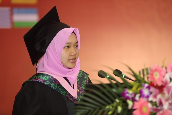 其实,我从未想到过自己长大之后会选择这个专业、会说汉语,更没有想到我会成为一名汉语老师。我高中毕业之后,原来想当数学老师,但在妈妈的建议下,我改变了想法。非常感谢父母(可惜他们今天不在现场),感谢他们一直相信我、鼓励我,他们的支持让我走到了今天。我还想对妈妈说,感谢您当初的建议!同时,也向今天所有出席和未能出席我们毕业典礼的各位家长表示由衷的感谢,感谢你们的养育之恩,是你们的爱给了我们追求梦想的力量。