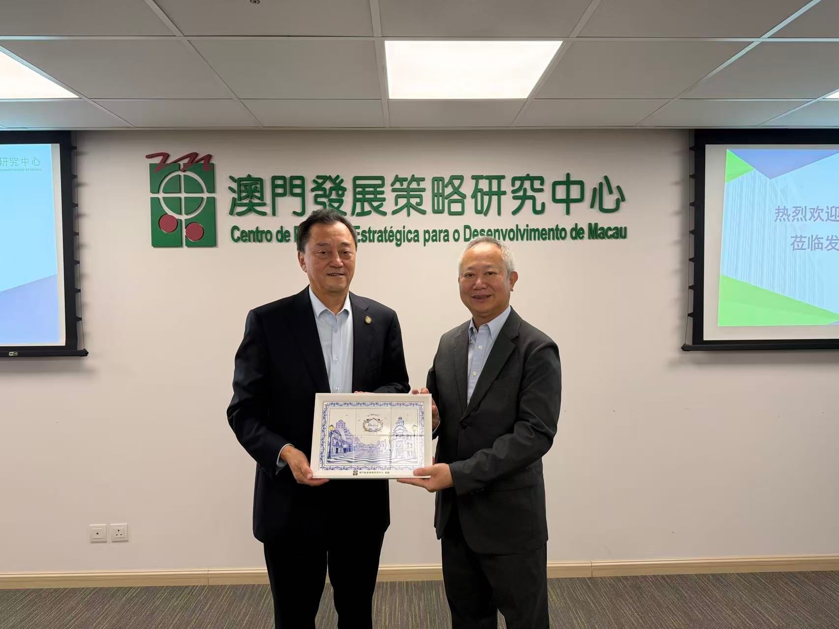 在澳门发展策略研究中心,倪海东书记、张宝钧副校长一行与中心会长萧志伟、监事长郭敬文、秘书长陈志峰、中心理事何思雅等会谈。陈志峰秘书长详细介绍了澳门发展策略研究中心的建立背景与发展历程,重点阐述了在青年人才培养方面的长期投入与工作成果,萧志伟会长强调了发策中心在澳门政策创新与制度创新方面所发挥的独特作用与贡献。基于澳门当前进入新发展阶段的时代背景,双方一致认为,未来可重点围绕横琴粤澳深度合作区建设机遇,进一步拓展在学术交流、课题研究与人才培养等领域的务实合作。