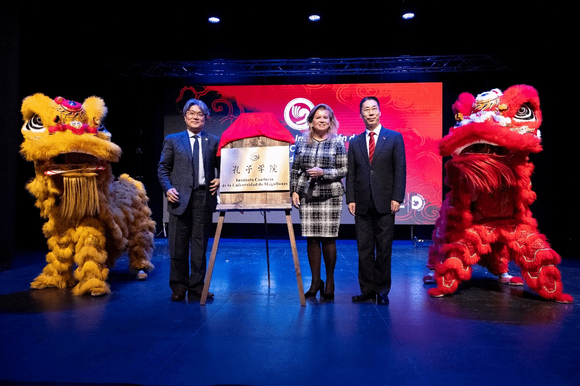 随后,在现场热烈的掌声中,玛丽拉·阿拉尔孔副校长、牛清报大使、张宝钧副校长共同为麦哲伦大学孔子学院揭牌。