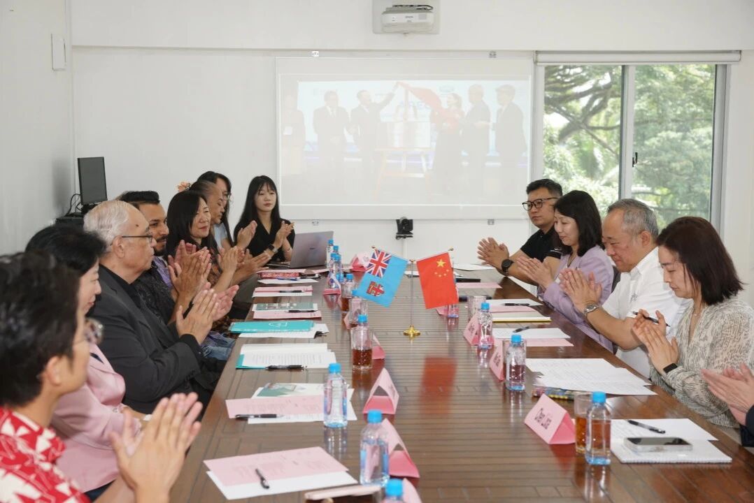 在与中国驻斐济大使馆临时代办汪元的会谈中,段鹏校长表示,北京语言大学将在使馆的指导和支持下,认真落实两国领导人达成的重要共识,持续支持中文教育在斐济的发展,助力中文教育融入国民教育体系,并辐射汤加、帕劳、瓦努阿图、图瓦卢等周边国家。同时,积极推动与斐济顶尖大学合作建设中国研究院,举办高水平论坛与学术交流活动,深化斐济人民对中国道路、中国模式、中国经验的理解,不断拓展文化、青年等领域的交流渠道,促进两国青年相知相亲、互学互鉴。