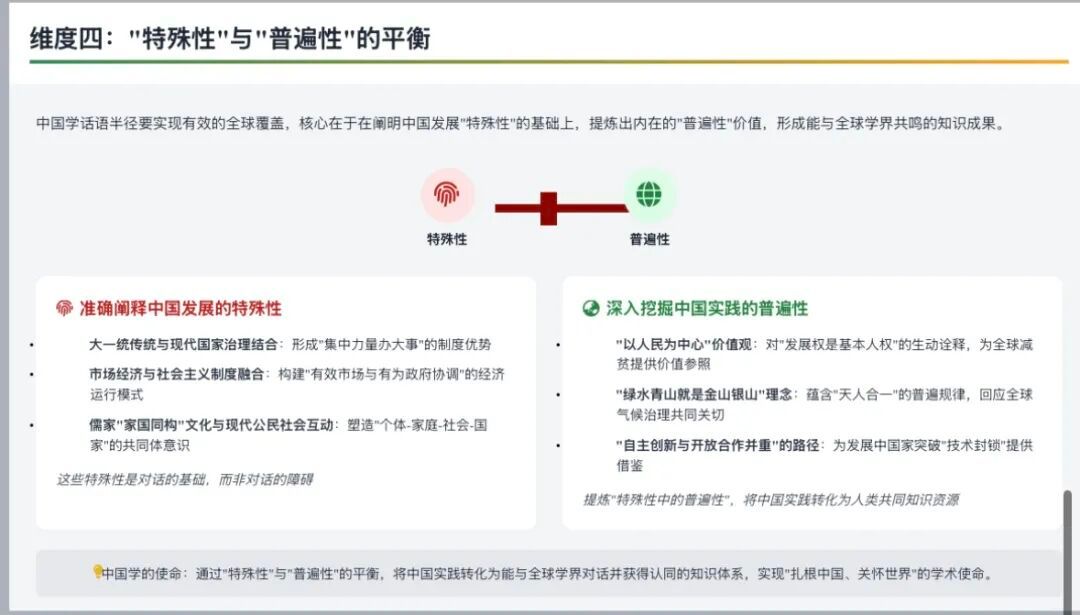中国学话语半径要实现全球范围内的有效覆盖,核心在于在厘清中国发展“特殊性”的基础上,提炼其中蕴含的“普遍性”价值,形成全球学术共同体可共鸣的知识成果,避免“强调特殊而忽视普遍”与“追求普遍而消解特殊”的极端倾向。