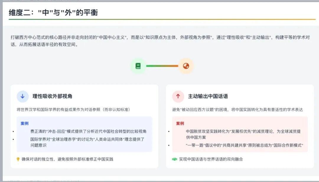打破西方中心主义的核心路径,并非走向封闭的“中国中心主义”,而是以“知识原点为主体、外部视角为参照”,通过“理性吸纳”与“主动输出”构建平等学术对话,拓展话语半径的有效空间。