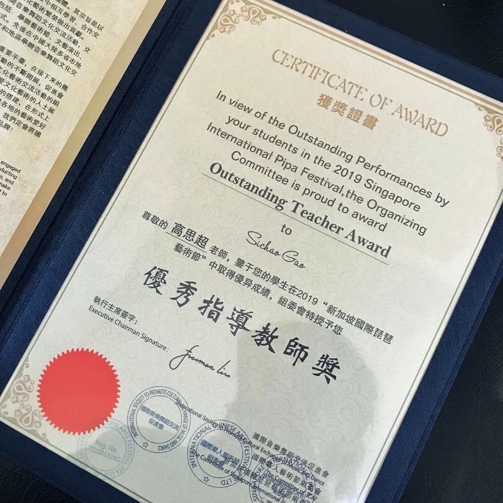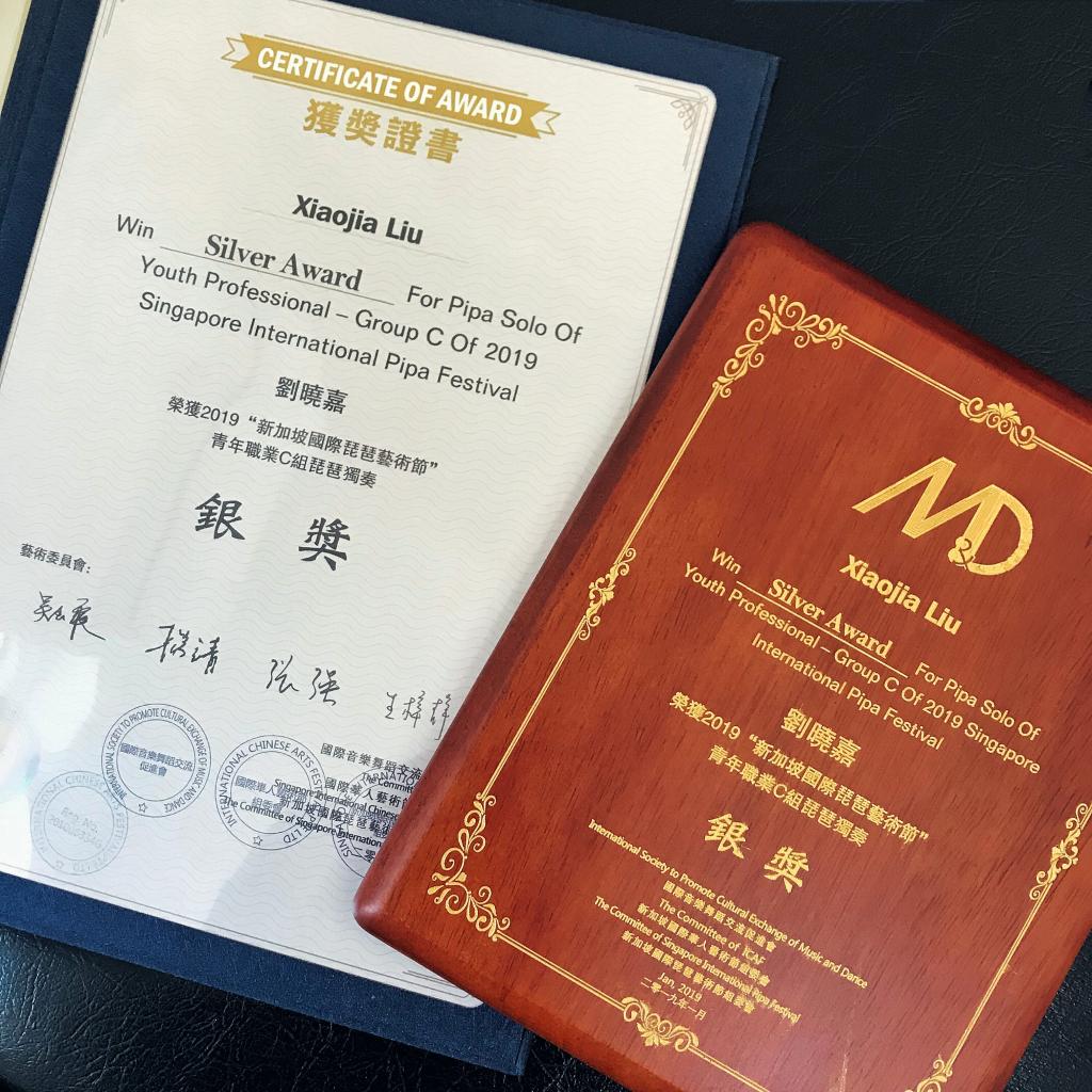 我校艺术学院师生积极组织参赛展示音乐国际教育与传播专业风采,在我院琵琶教师高思超的指导下,2017级音乐国际教育与传播专业刘晓嘉同学凭借扎实的基本功,优秀的舞台表现力,出色的临场发挥得到了专家评委的肯定与好评,最终获得了“青年职业C组琵琶(独奏)银奖”,为我校争得荣誉。同时,高思超老师受邀参加此次艺术节评审工作,并荣获“新加坡国际琵琶艺术节——优秀指导教师奖”。
