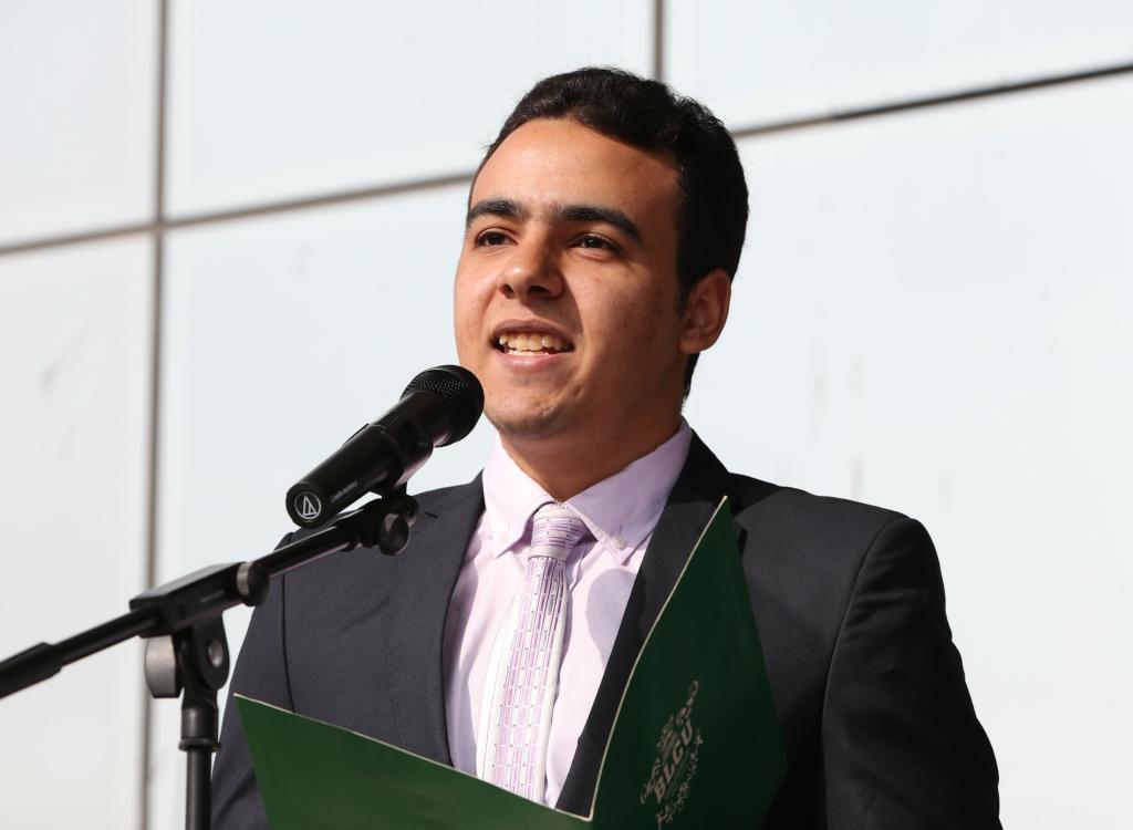 汉语国际教育学部进修学院的埃及留学生文超作为运动员代表发言。他说,一年一度的运动会是全校师生齐聚一堂的盛会,同时也是团结、奋进、友谊紧紧凝聚的美好时刻,见证了激情、朝气与梦想。比赛总有输赢,但情谊却永远无价,虽然运动只有短短的一天,但是来自全世界不同国家的留学生,会永远记得这一天的汗水与拼搏,记住北京语言大学。