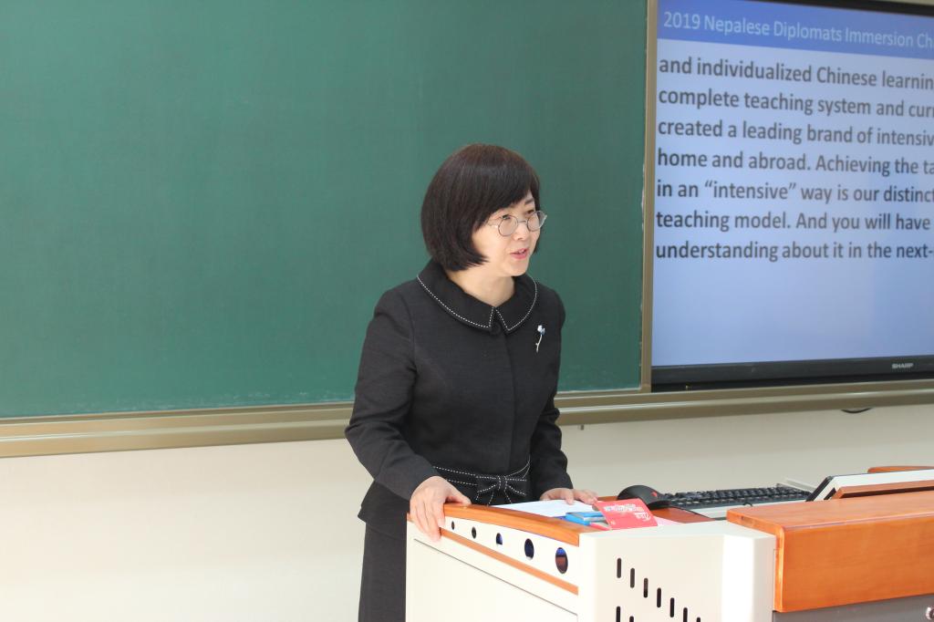 苏英霞院长向大家介绍了汉语速成学院在国际汉语教育方面的优势和特色,在全球汉语学习需求日益多元化、个性化的背景下,速成学院已打造出国内外领先的汉语速成强化教学品牌。苏院长表示,汉语速成学院对尼泊尔外交官汉语培训项目高度重视,组建了优秀的教师和管理团队,根据学员的学习目标和学习特点进行了有针对性的课程设计。培训课程将体现沉浸式“汉语+”特色,除汉语课以外,还有中国社会文化讲座、文化体验、实地参访考察、中外学生座谈等丰富多彩的课程和活动。教学目标是在有限的时间内,帮助学员快速高效地提高汉语表达能力并加深对中国社会、经济和文化的了解。苏院长希望同学们能够在北京语言大学这个“小联合国”里度过充实而愉快的时光。
