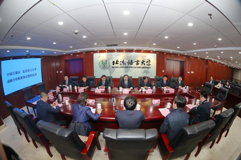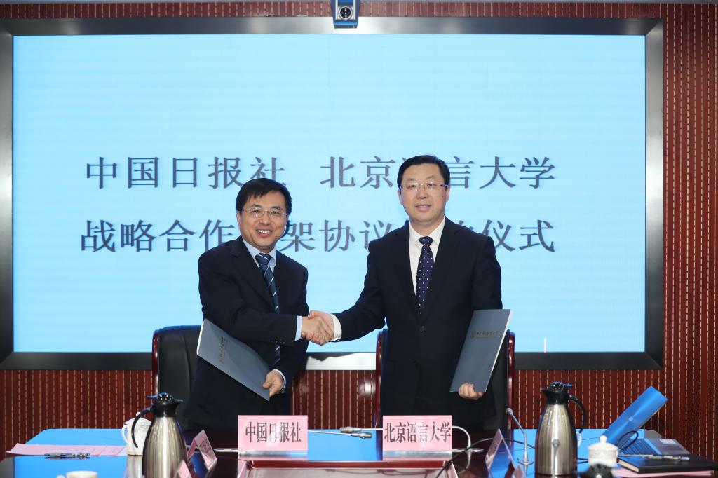 中国日报社王浩副总编辑与北京语言大学刘利校长共同签署了《中国日报社与北京语言大学战略合作框架协议》,该协议旨在建立并加强中国日报社与北京语言大学的友好关系,更好地发挥各自的资源优势,共同推动国际传播能力建设,努力实现双方事业的比翼齐飞。