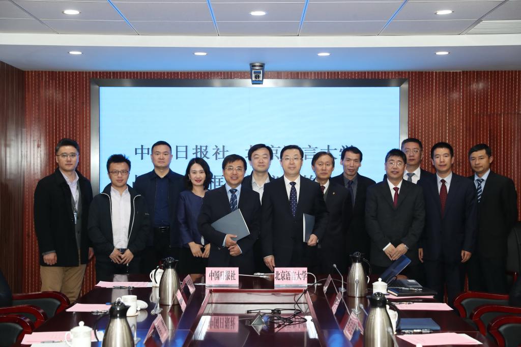 4月27日下午,中国日报社与北京语言大学战略合作框架协议签订仪式在综合楼909会议室举行。中国日报社副总编辑王浩,北京语言大学校长刘利、副校长张旺喜等出席签约仪式。