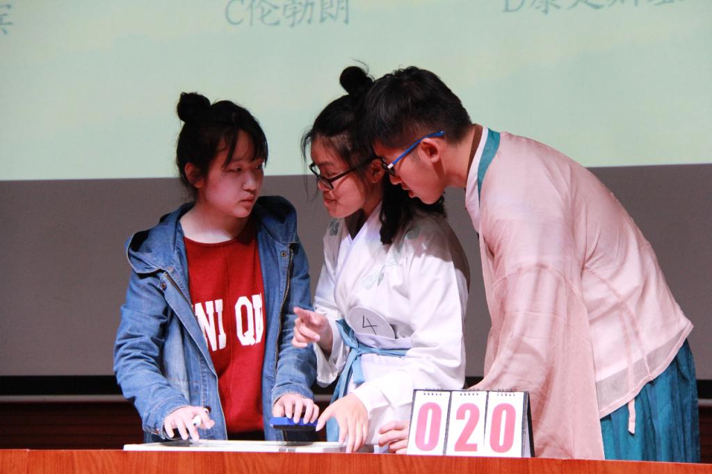 经过前两轮的比拼,只拿纪念品队,选择题全队和蘩星队进入最后一轮“诗韵定乾坤”,本轮以抢答的形式展开。在紧张的气氛中,选手们屏息凝神,目光炯炯,摩拳擦掌。难度较高的题目和激烈的手速比拼挑战了选手们的心理素质和人文素养。经过数轮惊心动魄的抢答,只拿纪念品队取得了最终的胜利。