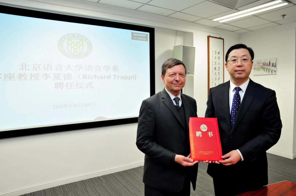 4月24日下午,语言学系举行了客座教授聘任仪式,聘任维也纳大学汉学家、“拉贝和平奖”获得者、“奥地利共和国金质勋章”获得者、中国国家级教育对外交流项目“重返中国”高级汉语人才杰出代表、维也纳大学孔子学院院长李夏德(Richard Trappl)教授为客座教授。北京语言大学校长刘利、北京语言大学校长助理、人事处处长郁有学、国际合作与交流处副处长马铁石、《语言教学与研究》主编施春宏以及语言学系部分师生代表参加了聘任仪式。聘任仪式由语言学系主任司富珍主持。