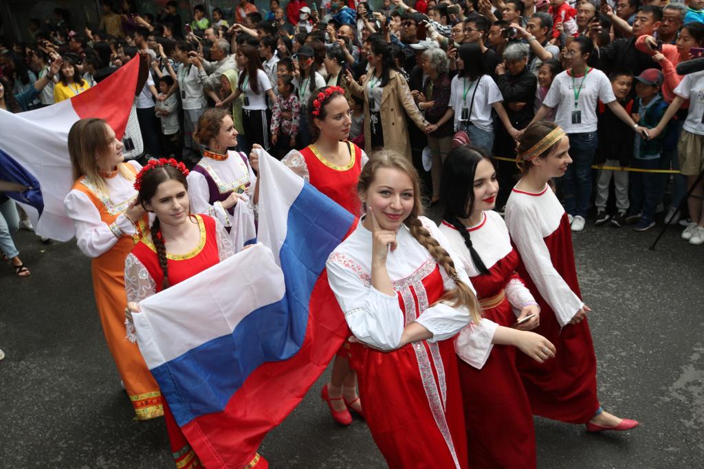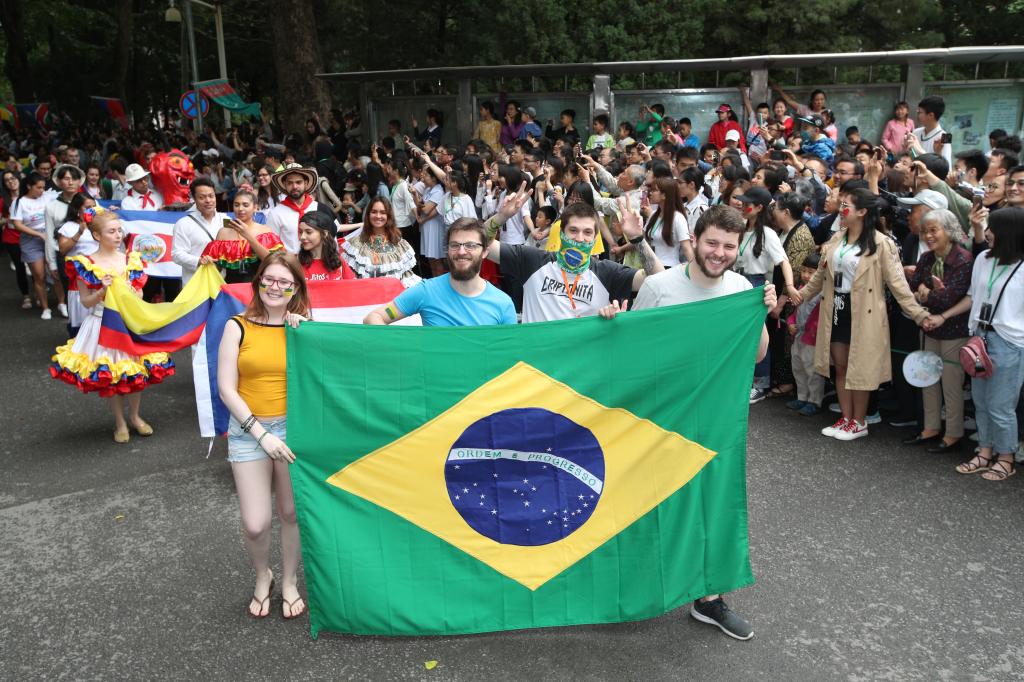 七彩长龙般的万国巡游队伍拉开了世界文化节游园会的帷幕。巡游队伍从北语东门出发,途经梧桐大道,向操场行进。各国留学生身披各具特色的本国传统服装,精心的装扮使他们别具风采,他们或手持国旗,或载歌载舞,尽展青春活力。巡游队伍穿过随风飘扬的万国旗,在梧桐大道上形成一道亮丽的风景线。梧桐大道两旁的观众叫好声、鼓掌声不断,伴随着巡游队伍的行进,他们也真正感受到了“小联合国”浓郁的国际氛围与兼容并蓄的情怀,体验着“世界脉动”。