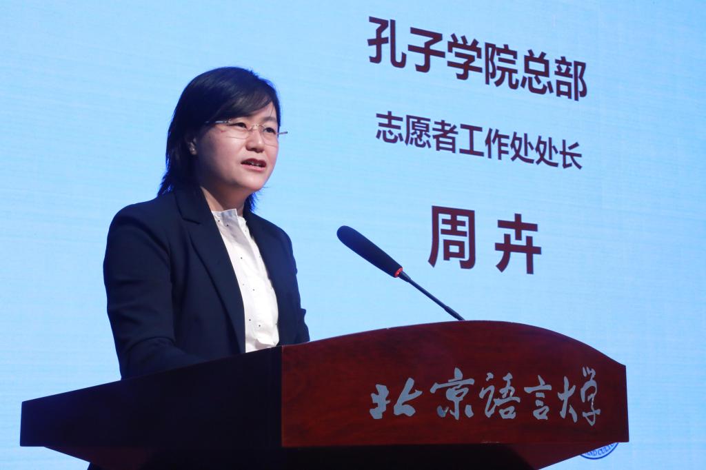孔子学院总部志愿者工作处周卉处长在发言中首先充分肯定了北京语言大学为此次培训所做的精心筹备和周密安排。接着她回顾了孔子学院创立15年,同时也是汉语教师志愿者项目设立15年以来所走过的栉风沐雨的光辉历程。她表示,15年来孔子学院共派出54000多名汉语教师志愿者们奔赴世界各地,这些志愿者们始终秉持着“奉献、友爱、互助、进步”的志愿精神,克服各种身心困难,满怀激情地在平凡的岗位上默默耕耘,逐渐成长为“独立、自信、友善、包容”的孔院人,为世界人民学习汉语、增进对中国的了解贡献了自己的力量。因此他们也获得了“中国的名片”、“中外文化友好交流的民间使者”等诸多美誉。她期望这一批志愿者一如既往地保持严谨的态度、释放学习的热情、拥有开放的心态,在日后的工作和生活中真正成为连接中外友谊的桥梁。