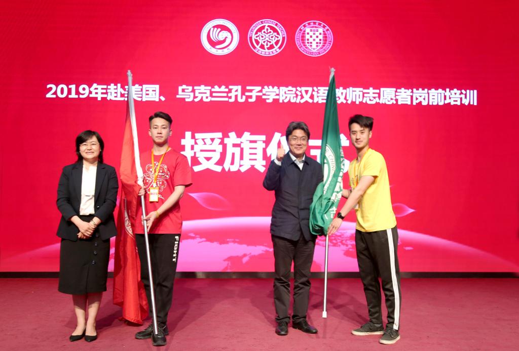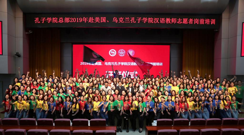 5月21日,孔子学院总部2019年赴美国、乌克兰孔子学院汉语教师志愿者岗前培训开班仪式在北京语言大学教一楼209报告厅举行。孔子学院总部志愿者工作处处长周卉、北京语言大学副校长张宝钧、汉语国际教育学部汉语速成学院院长苏英霞、外国语学部英语学院副教授王丽虹、培训专家代表国别和区域研究院学术院长黄靖、人文社会科学学部人文学院副教授黄悦、中国文化海外传播中心主任邱萍、国际教育管理处副处长黄潇潇,以及来自全国68所高校的205名即将赴美国和乌克兰任教的志愿者出席了开班仪式。