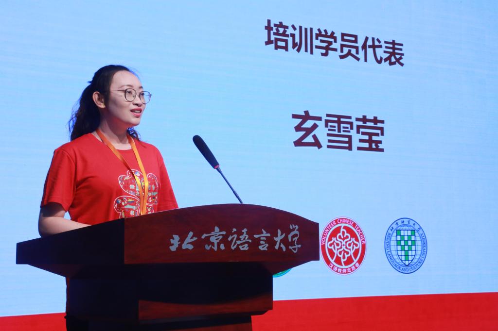 学员代表玄雪莹同学代表此次参加培训的志愿者们表达了对孔子学院总部和北京语言大学的衷心感谢。作为一名归国志愿者,她认为曾经的工作经历让她领会最深的就是作为中外文化交流使者的责任感和使命感,她表示在未来的赴外工作中将做好中国名片,讲好中国故事,为深植中外人民间的友谊贡献力量。