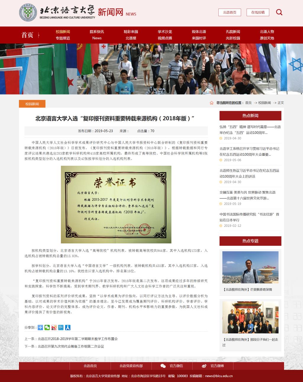 北语新闻网承载着学校对外形象展示、权威信息发布、文化引领和舆论引导。北语新闻网的运营始终坚持唱响主旋律,壮大正能量,以文化人,培育和践行社会主义核心价值观,推进学校文化建设,讲好北语故事,不断提高学校知名度和美誉度。