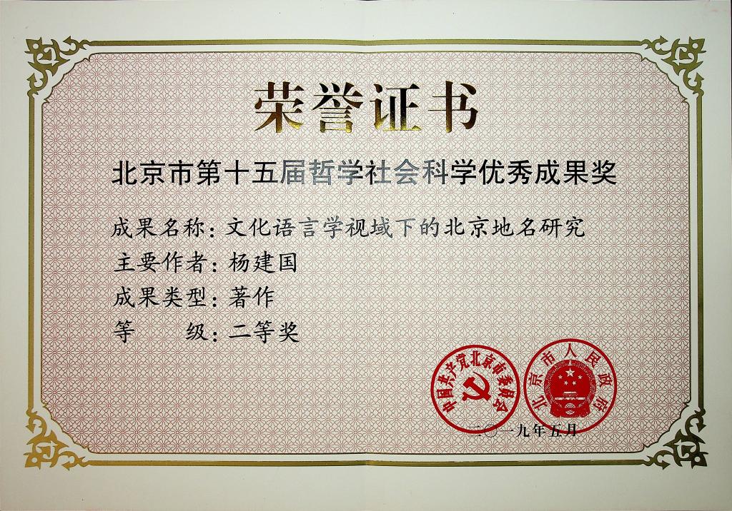 我校获得优秀成果奖二等奖的研究成果为杨建国教授撰写的专著《文化语言学视域下的北京地名研究》。该书以北京地名为考察对象,以文化语言学的研究视角全面系统深入地考察了北京城区及郊区的地名文化,通过对现存地名进行回溯,由地名的命名、更名理据梳理出北京城区和郊区的地名文化资源,并从其文化内涵的角度考察专名中蕴含的封建衙署、经济生活、驻军营卫、社会意识、社会心理、宗教信仰、民族融合、移民情况、宗族观念、历史人物(含民族英雄)、历史事件、传说故事、五色五行观念、地标建筑等诸多信息。借此让读者通过北京地名,了解历史上北京地区的社会经济发展、民族迁徙与融合、宗教信仰、军事活动与政治变革;也可以由此窥探中华民族的思维特点、思想观念、心理特征、审美特点等。