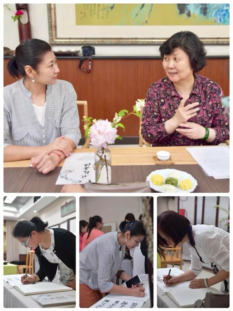 听琴之后,大家共同欣赏了明代文徵明的名画《品茶图》。《品茶图》描绘了一幅“山中茶事正好”的景象,让留学生初步体会到中国古代文人的生活情趣以及中国以茶会友的生活方式。不仅如此,为营造中国传统文人的审美意境,北语茶学堂还特别呈现了中式插花,表达了“世界和平、欣欣向荣”的美好寓意,让留学生全身心地沉浸入中国传统文化的雅致与美妙当中。