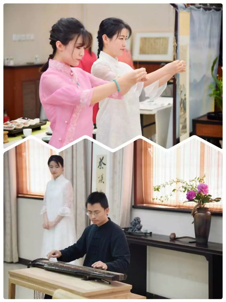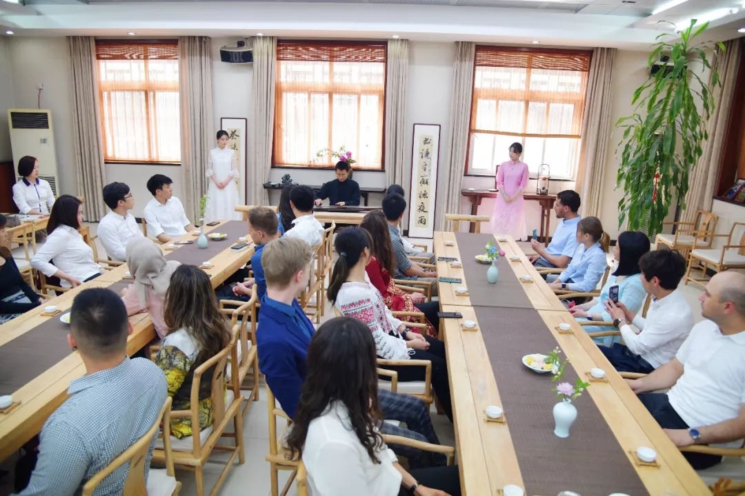 茶会在焚香中开启。灵香几缕,与茶香浸润交织,赋予茶会独特的仪式感,大家在品香中调息、静心。行香之后,琴师肖磊为大家演奏了古琴名曲《流水》。丝弦清音,伯牙子期之约,延续千年;如今跨越时空,嘉宾与留学生们一道共听古曲,陶醉于中国古琴的悠悠音律当中。