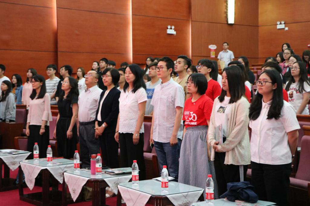 6月3日上午,由港澳台办公室和汉语进修学院联合承办的北京语言大学2019上半年“国家语委普通话水平测试与文化考察研修班”联合开班仪式在逸夫报告厅举行。香港教育大学中国语言学系韦海英、汉语进修学院副院长牟世荣、港澳台办公室主任马铁石以及来自香港、澳门七所院校的近百名同学参加开班仪式,港澳台办副主任蔺劼主持仪式。