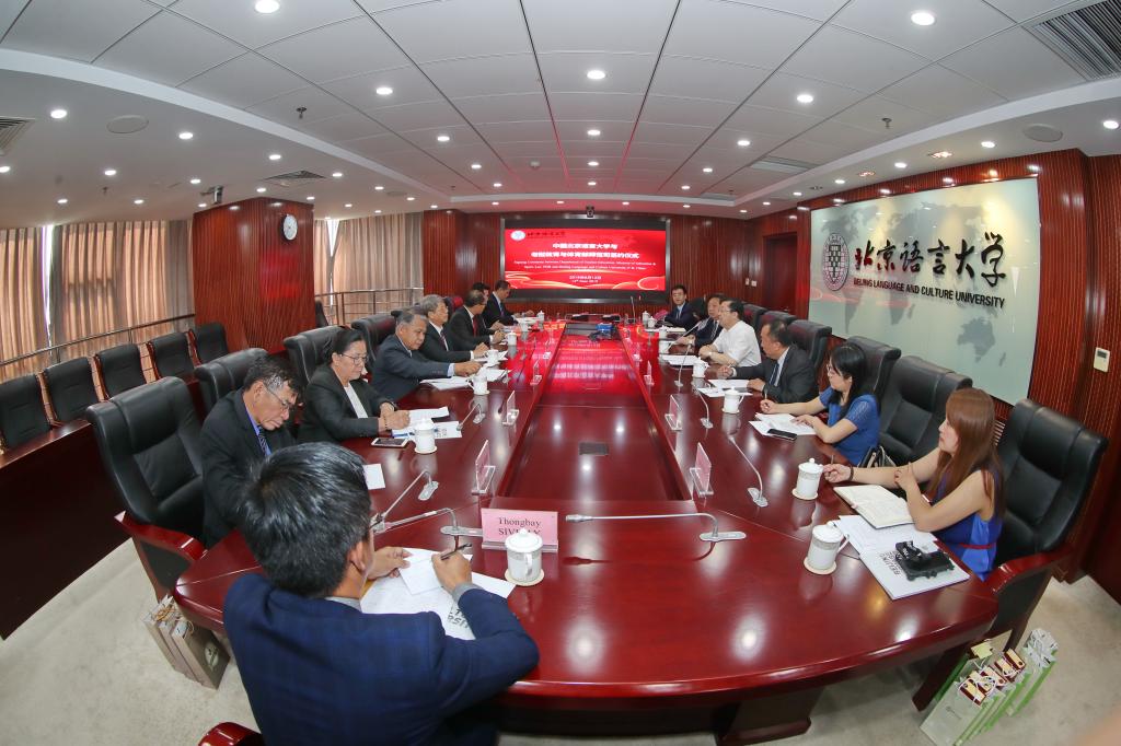 首先,国际合作与交流处马铁石副处长对来访一行表示热烈欢迎,并介绍了出席嘉宾。随后,刘利校长致辞,他说到,北京语言大学是一所有着60多年来华留学生教育的高等学府,已经培养了来自183国的20多万名懂汉语、了解中国文化的优秀毕业生,他们有些人成为国家政要、学者、外交家,活跃在各行各业中。正如前几天当选哈萨克斯坦总统的托卡耶夫,便是八十年代来我校学习的优秀校友。北语也为老挝人才培养做出一定贡献,迄今为止北语共培养274名老挝籍留学生,目前在校生中有23名老挝籍留学生正在我校学习。中老两国山水相连,是彼此人民的友好兄弟。在两国领导人的努力下,启动了中老命运共同体倡议,还举办了中老旅游年,可以说当前是两国关系的历史最好时期。北语积极参加一带一路倡议,是中国实施此倡议的重要高校之一。北语的语言资源高精尖创新中心设立了“中国周边国家语言资源库建设”项目,对其语言资源开展研究和保护,得到了老挝有关政府、高校和专家学者的认可和支持。2018年12月,语言资源高精尖创新中心主任李宇明书记赴老挝参加第六届大湄公河区域民族研究国际会议,在会议期间与老挝教育与体育部师范司领导进行座谈并就双方合作达成初步共识。此次签署备忘录将是打通一带一路合作的务实举措。