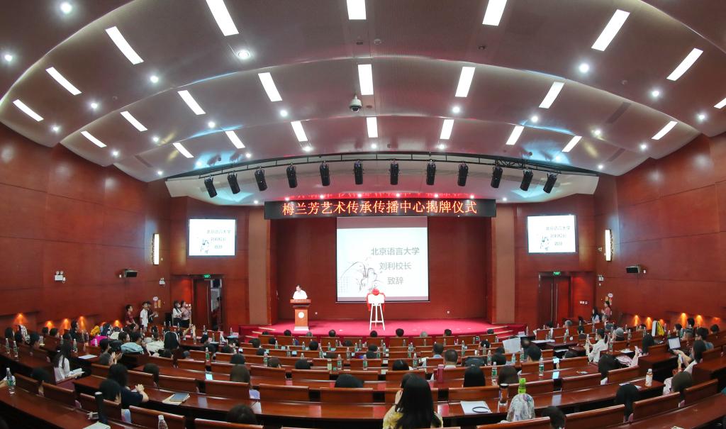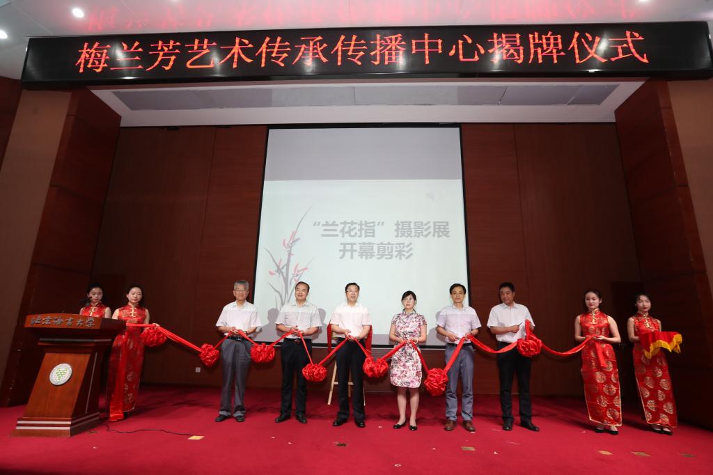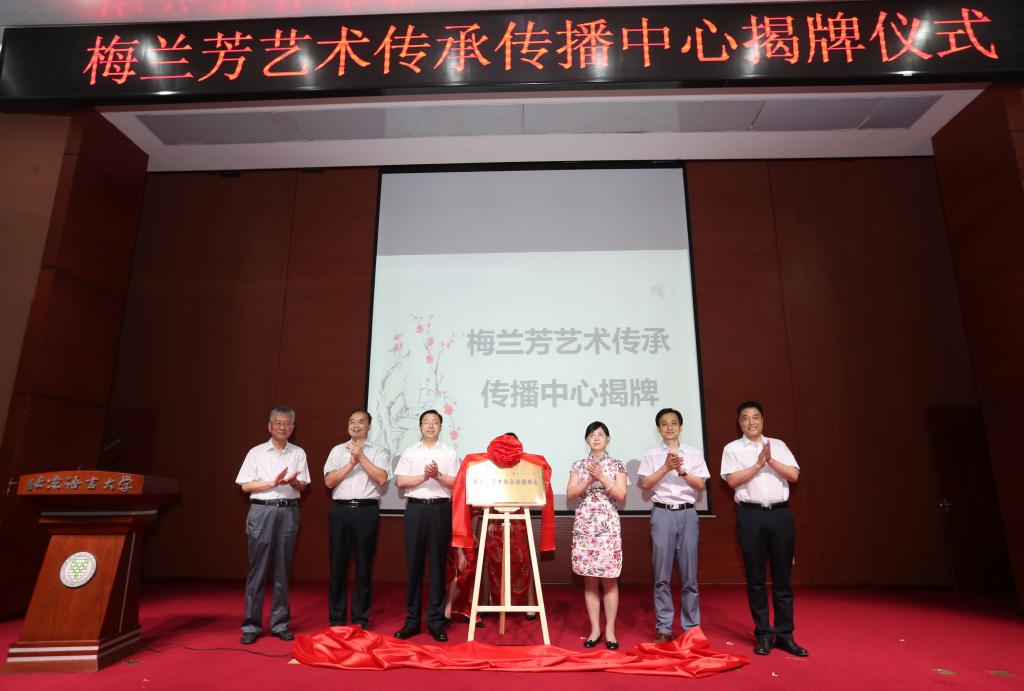 国家文化和旅游部艺术司周汉萍副司长、国家文化和旅游部非遗司胡雁副司长、北京语言大学刘利校长、梅兰芳纪念馆刘锁荣副馆长、北京语言大学中华文化研究院韩经太院长等嘉宾为梅兰芳艺术传承传播中心揭牌。
