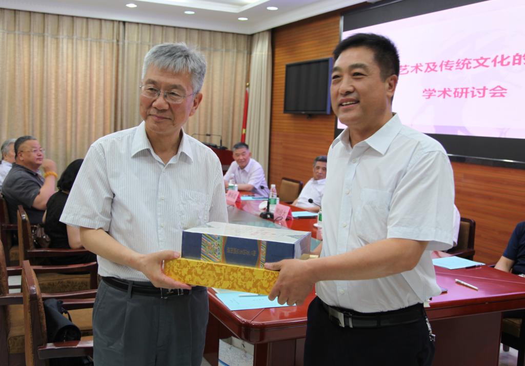 梅兰芳纪念馆副馆长刘锁荣将近几年关于梅兰芳艺术及传统文化的研究成果赠予北京语言大学中华文化研究院。中华文化研究院韩经太教授接受赠书并表示感谢。