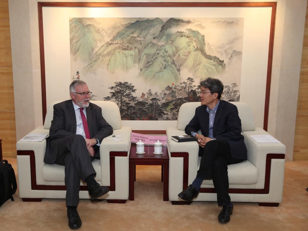 霍尔姆斯副校长十分感谢张宝钧副校长的友好会见。他表示,这是他本人第三次访问北语,之所以每次访问中国都要来北语看一看,是因为北语是他印象深刻且十分喜欢的校园。自从双方2016年签署合作备忘录之后,都柏林城市大学的多名教授先后来到北语进行交流和访问,其中有负责翻译技术、网络教学、外事合作等等。今年10月,都柏林城市大学将会再次安排校级领导访问北语,期待届时双方可以就翻译学科开展的合作项目签署具体合作协议。针对北语选送的优秀学生,都柏林城市大学将会给予奖学金奖励。此外,霍尔姆斯副校长对张宝钧副校长提到的语言康复学院以及语言智能研究院十分感兴趣。他表示,2020年都柏林城市大学将会开设人工智能与大数据分析硕士项目,这与北语语言智能研究院的研究领域契合,届时学生和教师也定会从双方合作中受益。